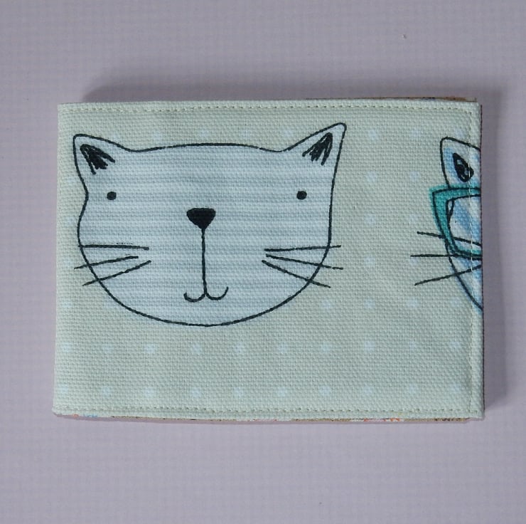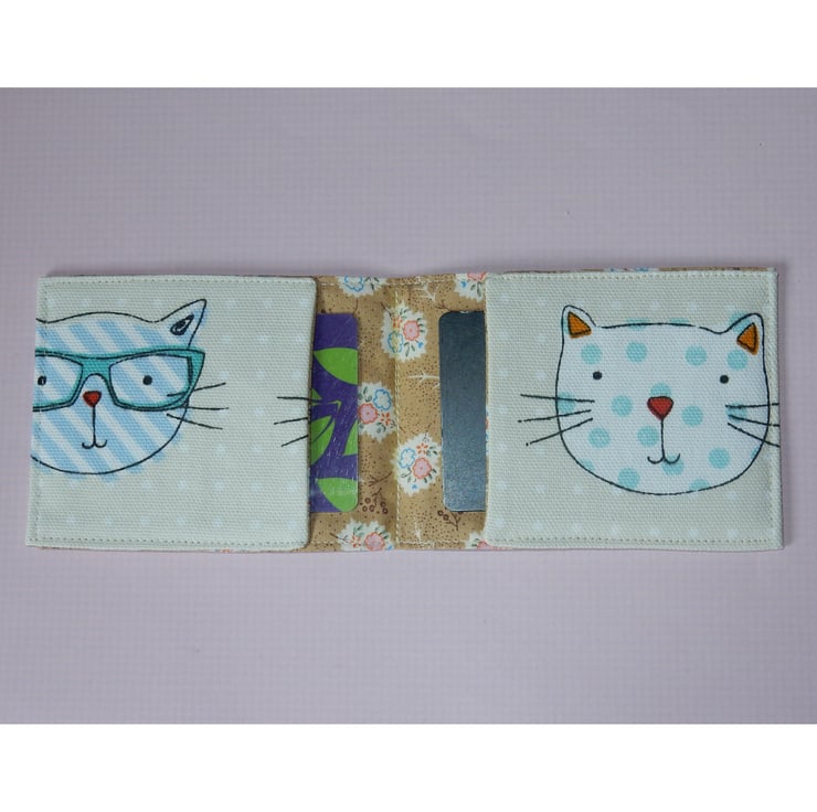 This is one for the cat lovers, an attractive little wallet is ideal for train tickets, travel cards, Oyster cards or credit cards. It features delightful cat faces, and it measures approx. 3.5 x 3 inches folded and 7.5 inches open. It is made from heavier weight cotton fabric, interfaced and lined in toning fabric.