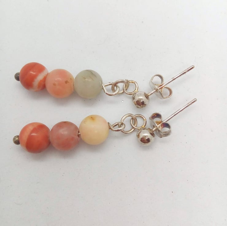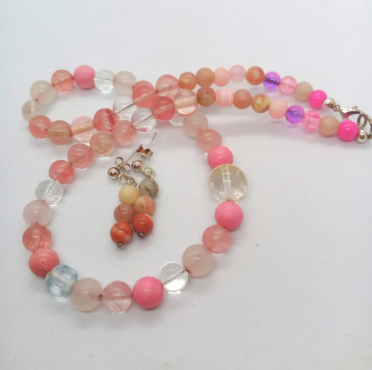 This very attractive jewellery set is made using different sizes shades of pink jasper and spider jasper beads, pink rose quartz beads and pink and clear glass beads. The sizes of the beads are 8 mm and 6 mm with a 15 mm clear glass bead at the centre. The earrings have silver plated ear studs and the necklace has a silver plated lobster clasp.