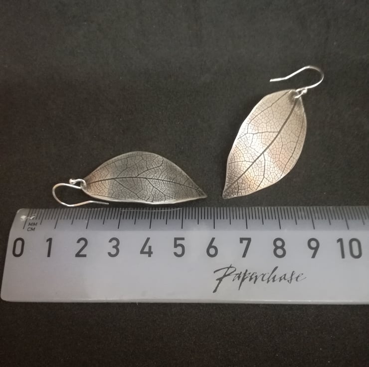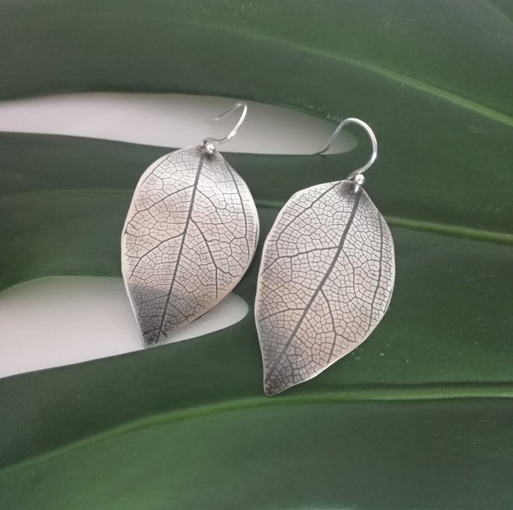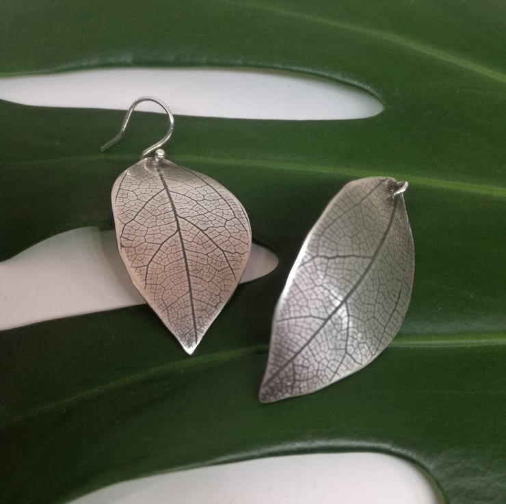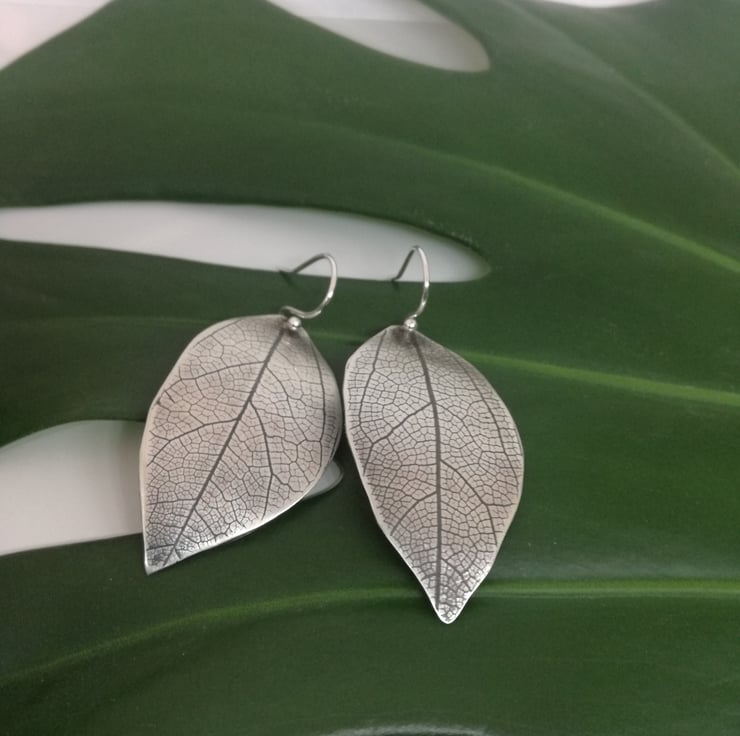 These earrings are made from taking a sheet of sterling silver. I then heat the silver to soften it and roll the silver with a skeleton leaf. After removing any sharp edges made when cutting out the shape by hand, I drill holes for the earring hooks and then oxidise the silver, turning it black. Then the process of carefully sanding the leaf begins and layer by layer of oxidation is removed until the black only remains in the impressed veins caused by the skeleton leaf. I finish the earrings by rubbing them with renaissance wax to reduce the tarnishing process and attach ear hooks.