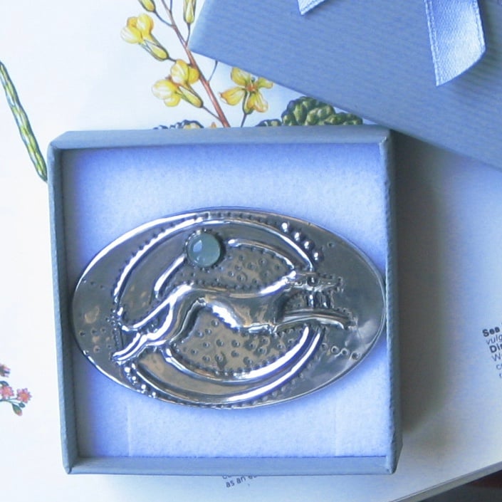 As featured in Landscape Magazine. Embossed with a running greyhound design, this large oval brooch has been handmade in shiny silver pewter in an Art Deco style. It has been set with a beautiful pale green aventurine gemstone. Blue agate gemstones are no longer available.