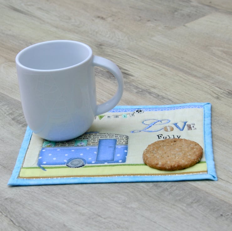 This beautiful mug rug, featuring a vintage caravan with the quote 'Love Fully' and 'Happy Camper' bunting, is big enough to accommodate your drink and a cheeky snack.