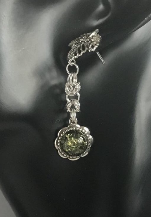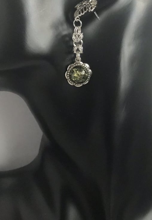 Individual Sterling Silver rings have been weaved into the Byzantine chainmaille pattern at the top of the drop of these earrings to which the rare Green Amber drop has been added.