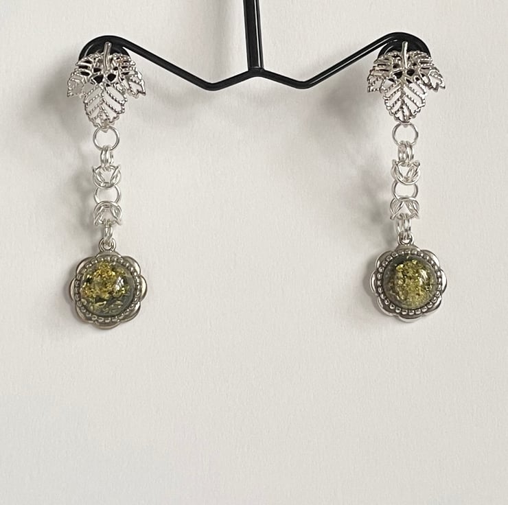 Individual Sterling Silver rings have been weaved into the Byzantine chainmaille pattern at the top of the drop of these earrings to which the rare Green Amber drop has been added.