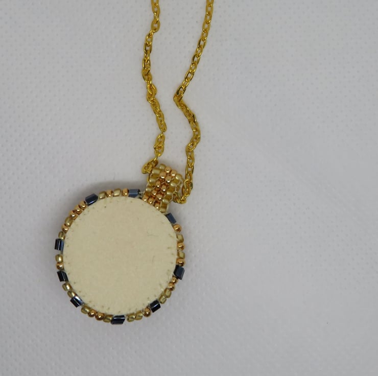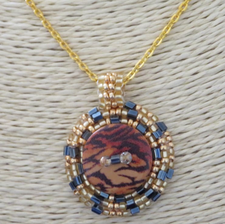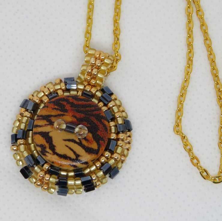 Grrr! Bring out your inner tiger with this tiger print button and bead embroidered pendant. The pattern on the wooden button is echoed in the bead embroidery surrounding it, using a mix of miyuki seed beads and black bugle beads. It is backed with cream ultrasuede and is finished with a bead stitched bail and gold plated chain with a lobster clasp.