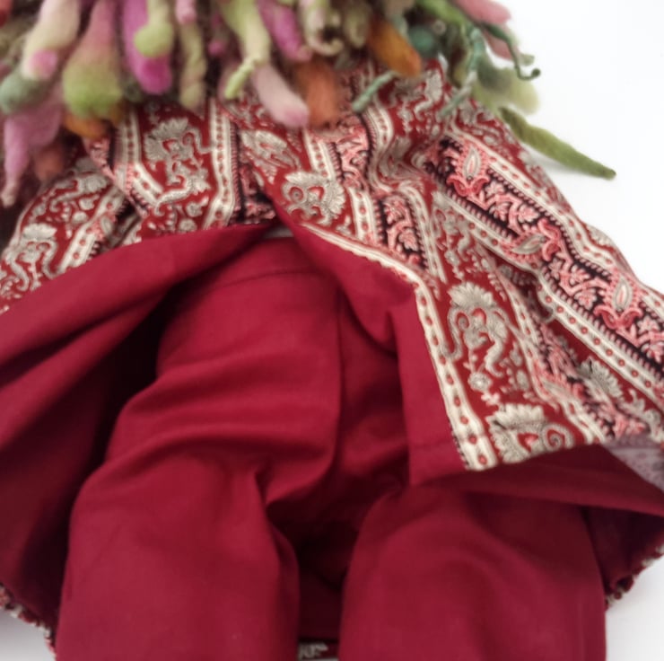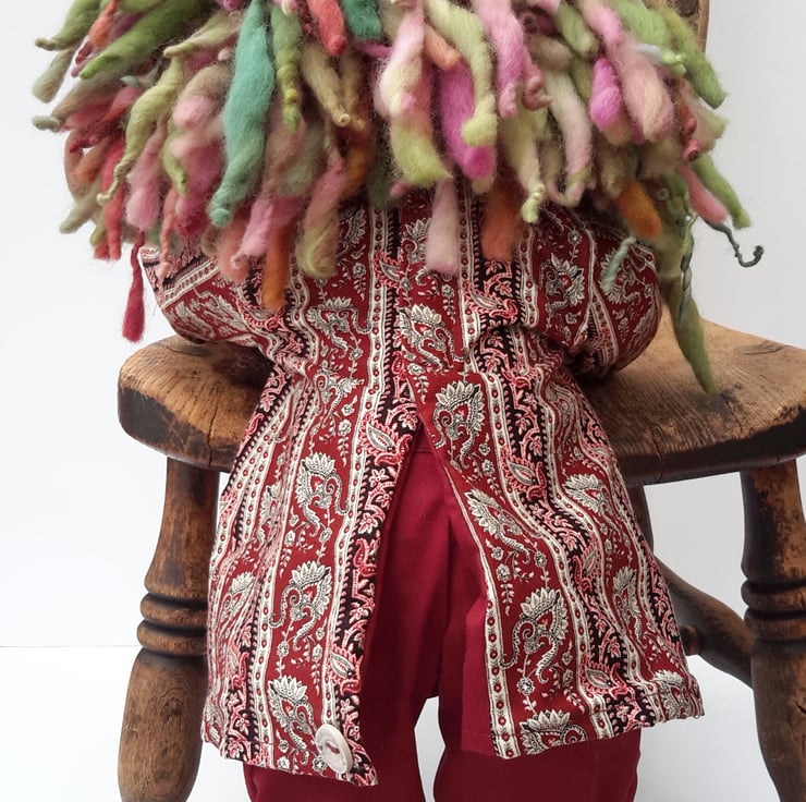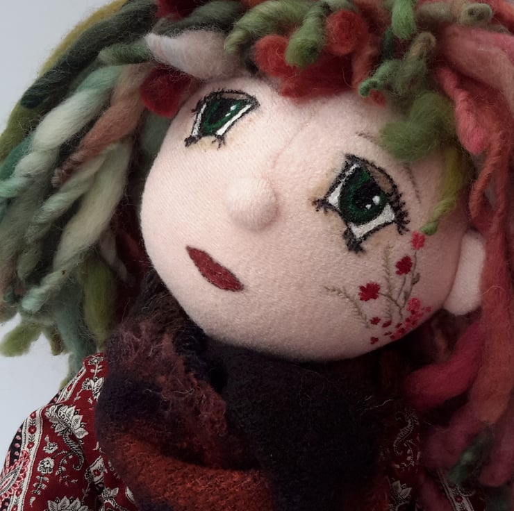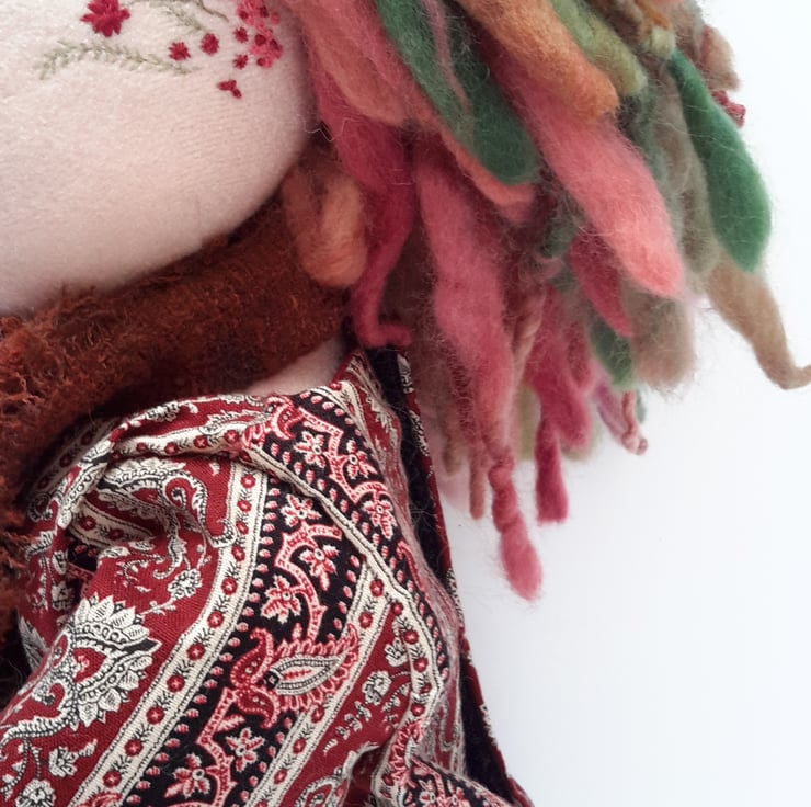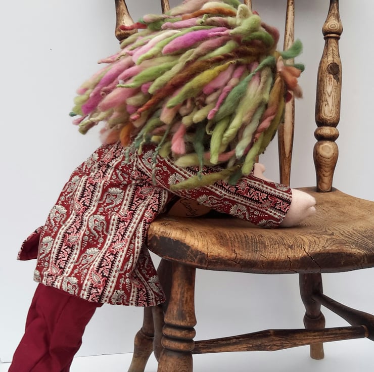 Calamity has very thick wild hair in greens, reds, pinks and purples, sewn on strand by strand taking around 3 hours in total and made from hand dyed and hand spun merino yarn.