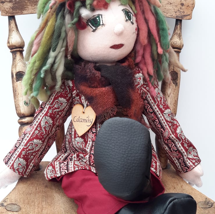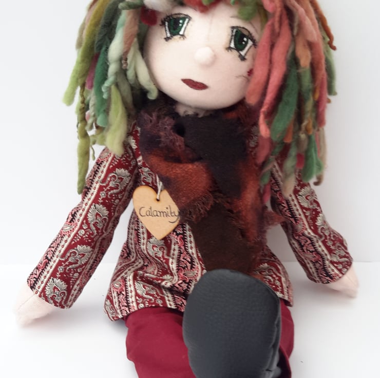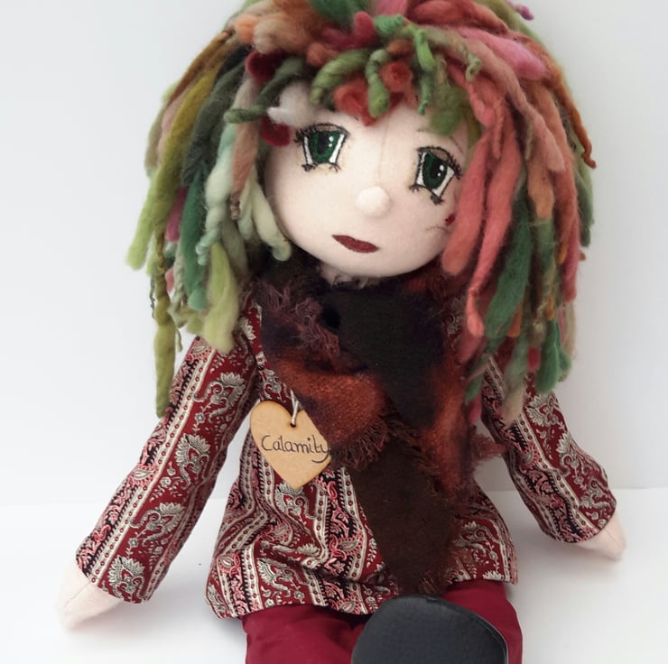 Meet Calamity, a beautiful handmade collectible cloth doll in luxury doll velour, fully jointed, wild and wacky merino hair, dressed in quality clothing.