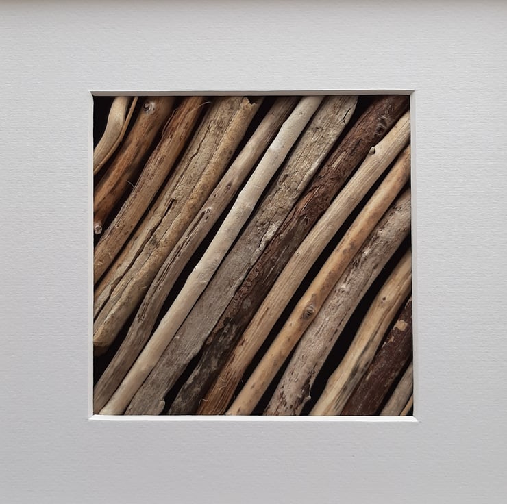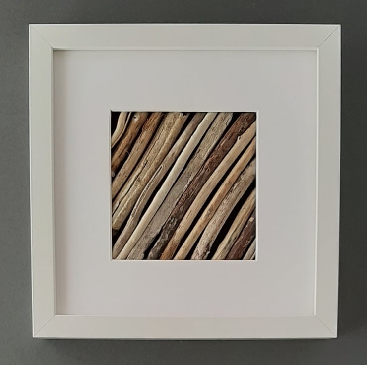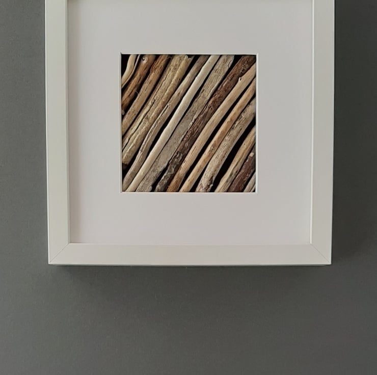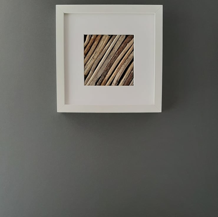 Driftwood collected from the beaches of the Isle of Wight is set in a deep white box frame and backed by coloured paper. This simple arrangement of driftwood allows the colours and textures of these beachcombed finds to shine though.