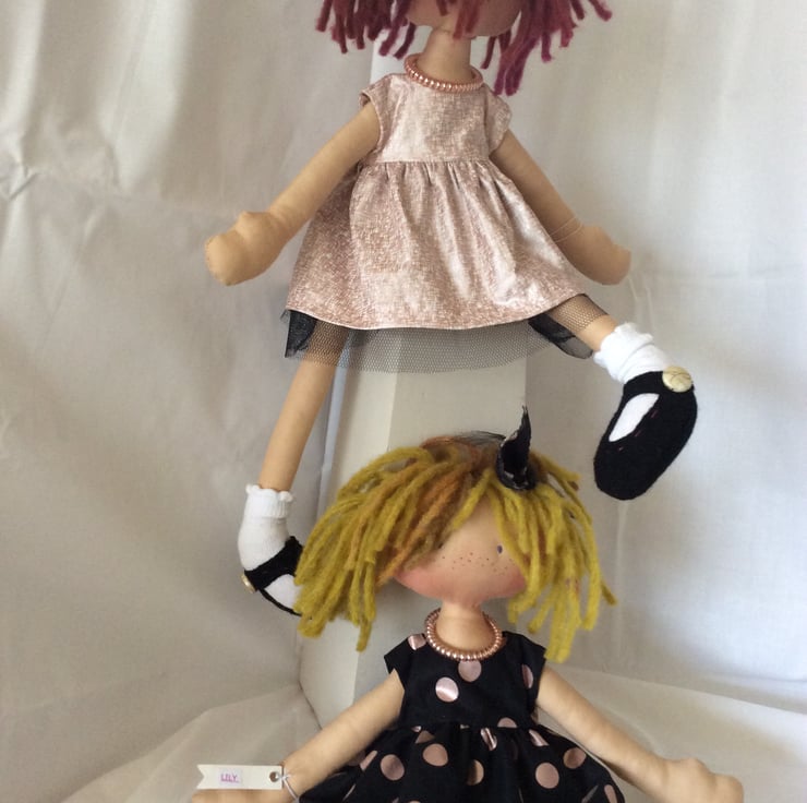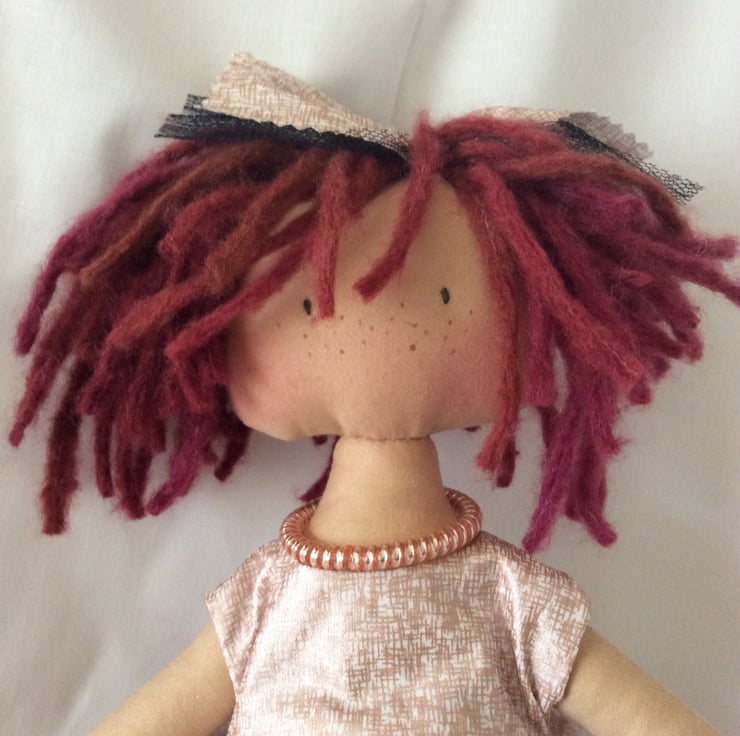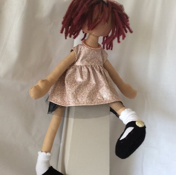 Bella just cannot wait to meet her new best friend. She is a very pretty rag doll and measures approximately 45cm (18”). Her body is tea dyed cotton with various man-made and natural materials for her clothes. She just loves her messy chestnut coloured bob cut hair. She has brown embroidered eyes and a lovely bead necklace. Pretty black Felt shoes over white socks with a white button. Her dress is cotton with a rose gold pattern and a pretty black net underskirt and for modesty she is wearing filly lace nicks.