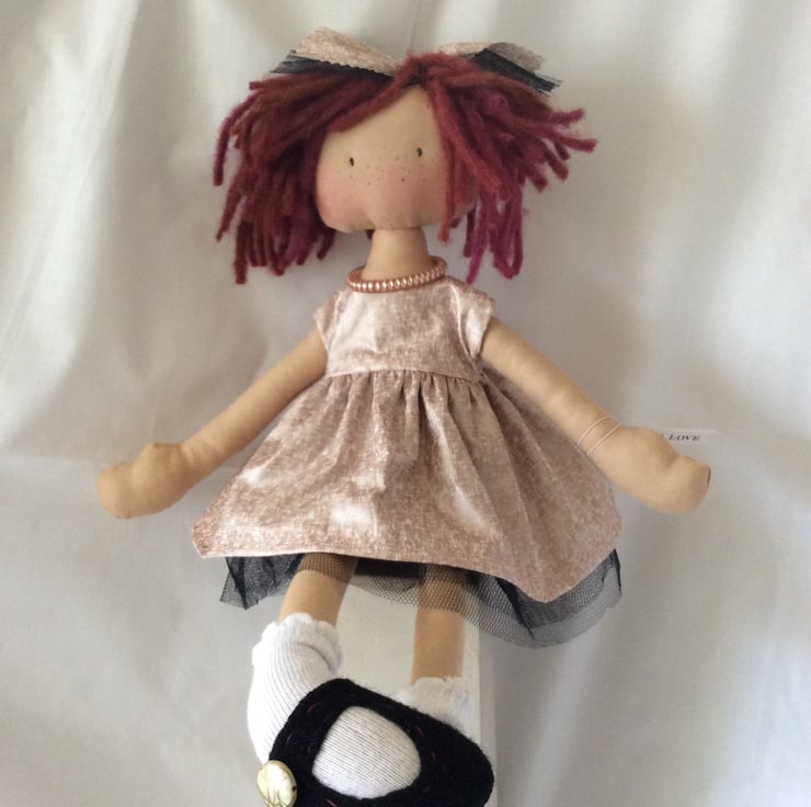 Bella just cannot wait to meet her new best friend. She is a very pretty rag doll and measures approximately 45cm (18”). Her body is tea dyed cotton with various man-made and natural materials for her clothes. She just loves her messy chestnut coloured bob cut hair. She has brown embroidered eyes and a lovely bead necklace. Pretty black Felt shoes over white socks with a white button. Her dress is cotton with a rose gold pattern and a pretty black net underskirt and for modesty she is wearing filly lace nicks.
