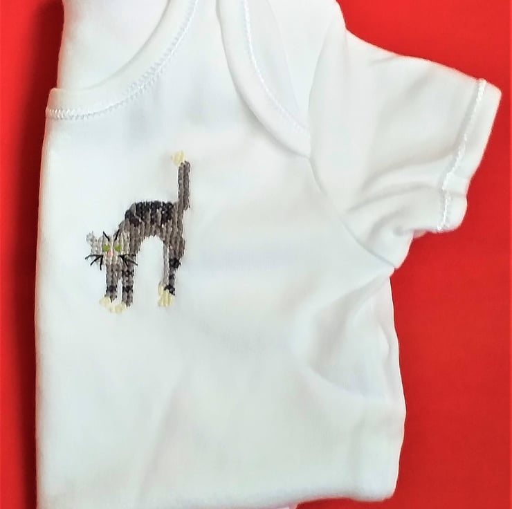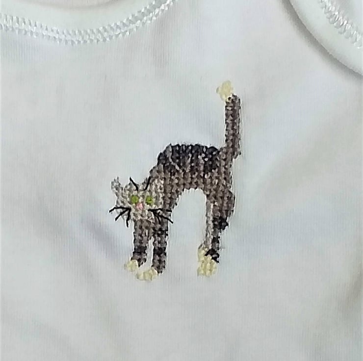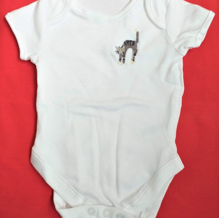 This is a lovely soft white vest/onesie with a hand-embroidered green-eyed tabby cat arching its back on the front. The vest has an envelope neck, short sleeves and three press-studs between the leg openings. As I never use a permanent backing material when embroidering kids' clothing, there is nothing inside to irritate your baby's skin. The vest is 100% cotton and can be machine washed.