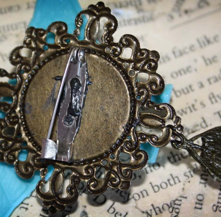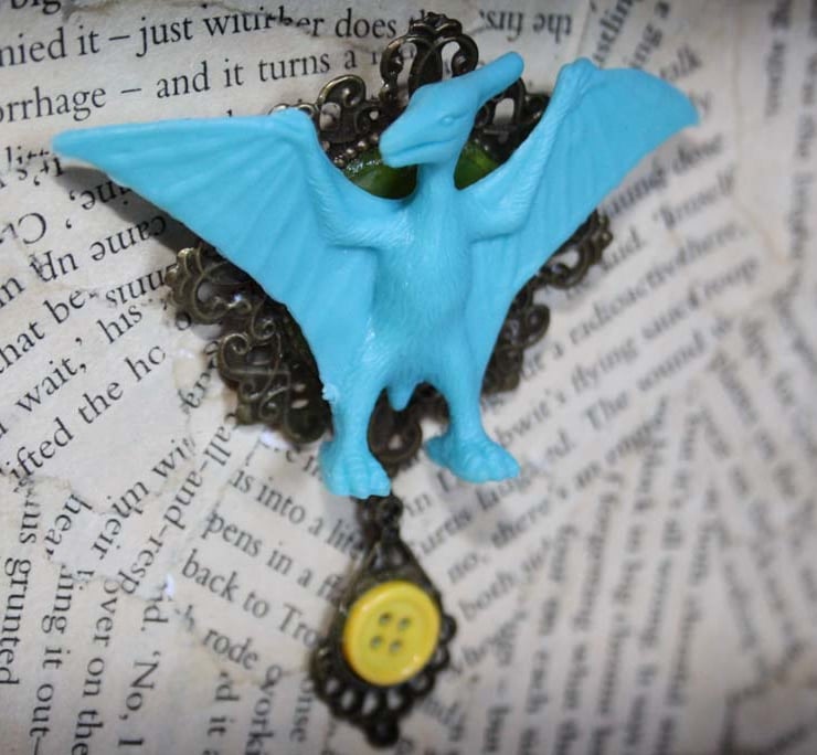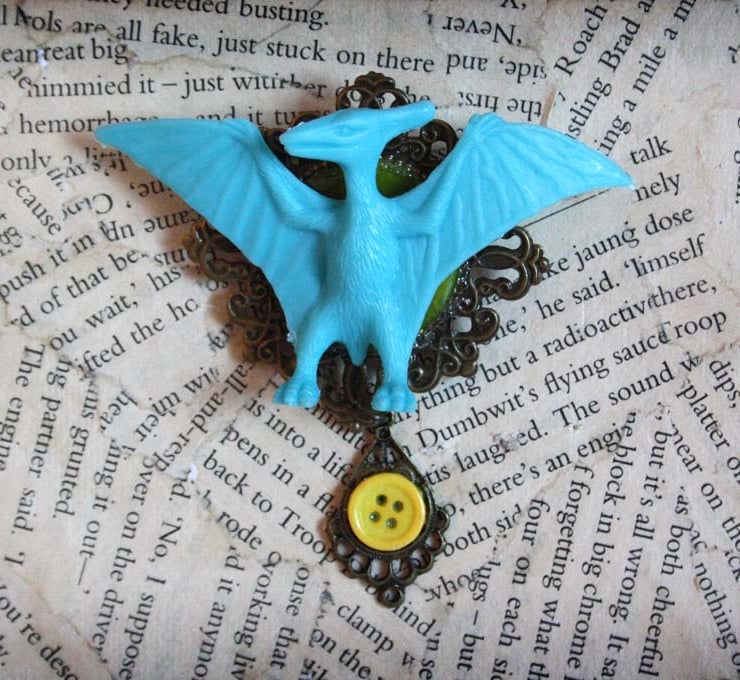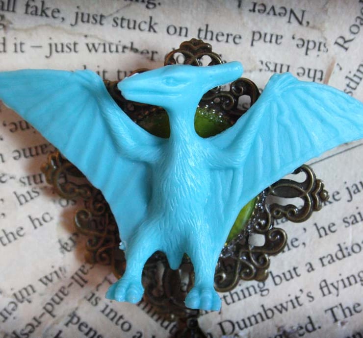 A turquoise colour pterodactyl dinosaur toy has been saved from landfill and has been transformed into a unique piece of statement jewellery. It has been mounted onto an antique gold tone cameo finding, which has attached to the reverse a metal brooch back. A smaller antique gold tone cameo finding hangs from this with a contrasting yellow button inset.