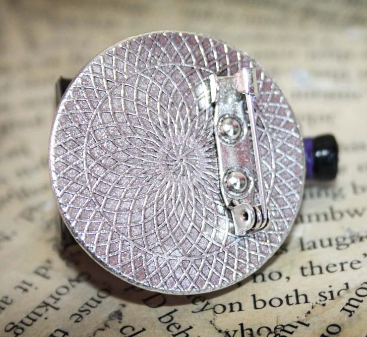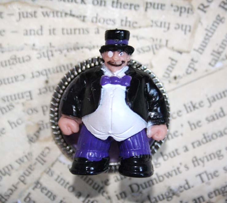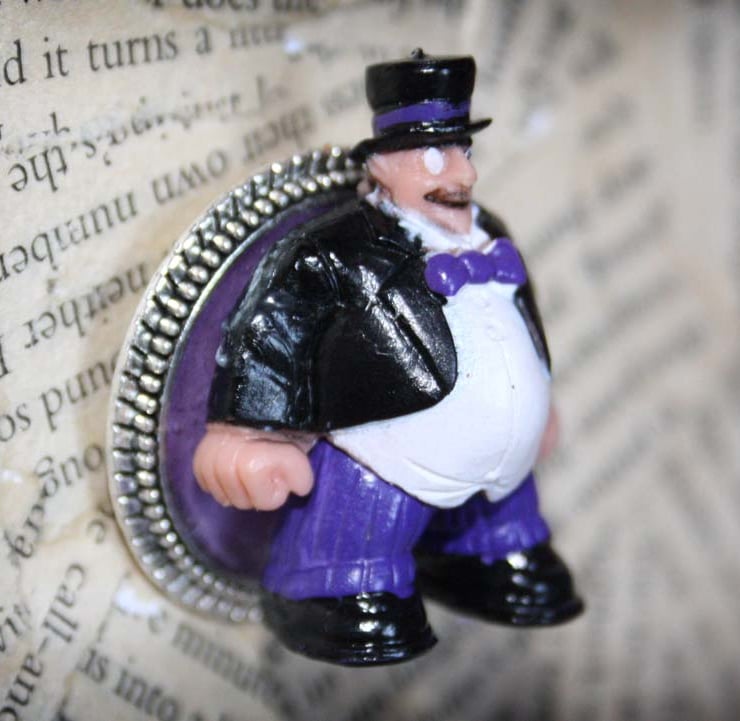 An old Penguin toy of Batman Villain fame has been saved from landfill by becoming an unique statement brooch. Mounted onto a silver tone came brooch finding, it has been infilled with scrapbook paper and sealed with a layer of resin.