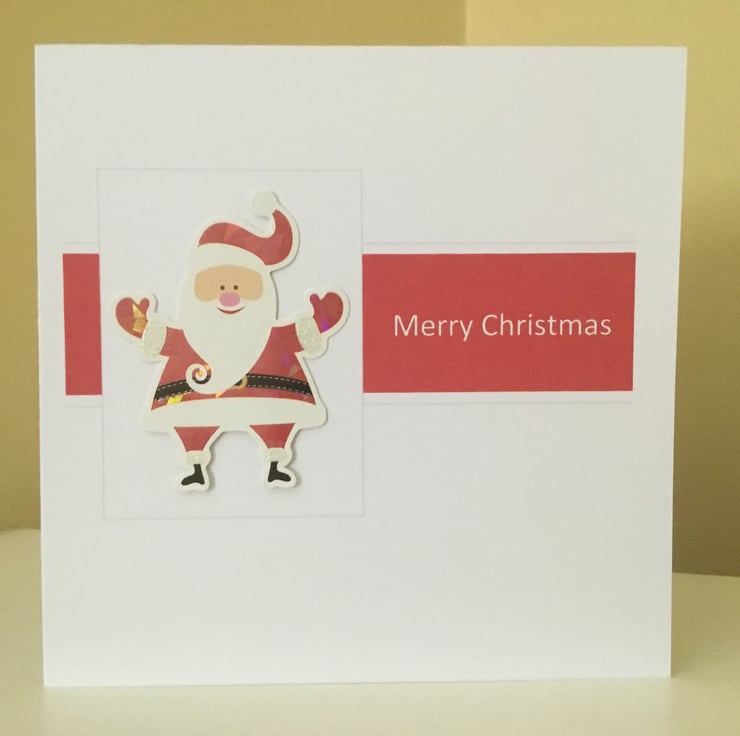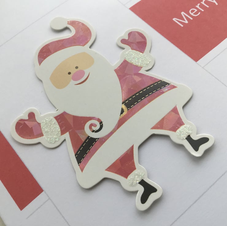A handmade Christmas card with a jolly, glittered Father Christmas embellishment.