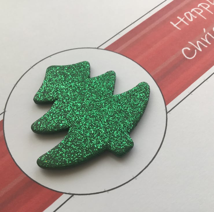 A handmade Christmas card with a glittered, wooden Christmas tree embellishment.