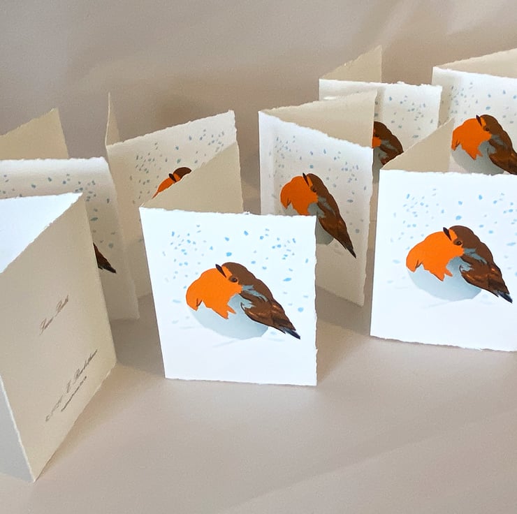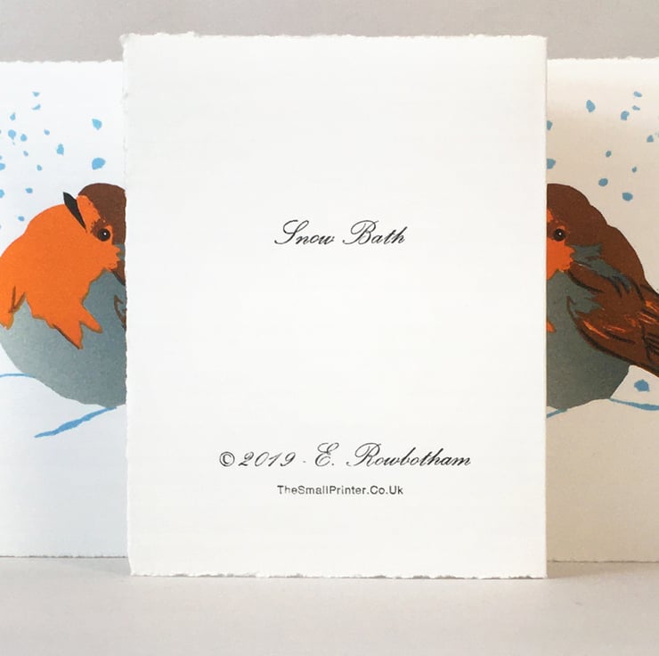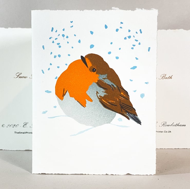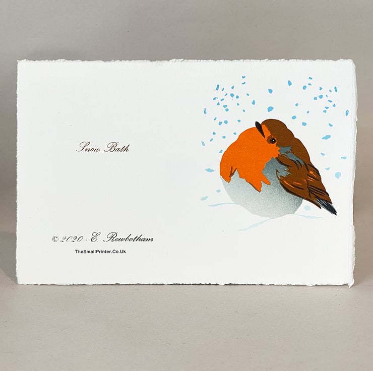 This is a Linocut Handprinted card featuring a red-breasted Robin, taking a Snow Bath. The image is made from 5 printed blocks (a lot of printing!) Robin is puffed up, brown wing (detailed with black & orange feathers) stretched out slightly from grey body, flinging the pale blue snow in a scattering snow bath. Black beak points skywards, eye looks at you with a playful twinkle.