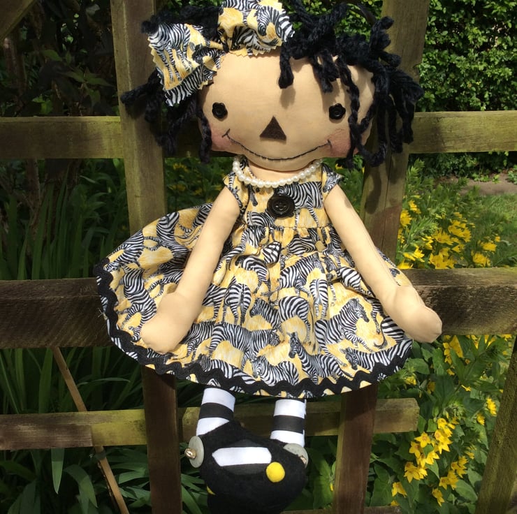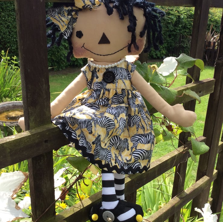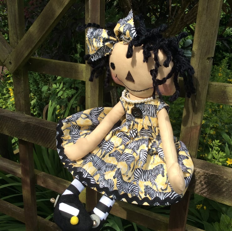Meet Zebra. She is a lovely doll who stands approximately 17” – She has Black button eyes and her body is tea dyed cotton with various manmade and natural materials for her clothes and hair with a pretty pearl necklace.. She has soft Black coloured Felt shoes with pretty yellow pom-pom, grey button and golden bell embellishment.. You can remove her dress and for modesty she is wearing filly lace nicks. She is cute and cuddly and looking for a new home.