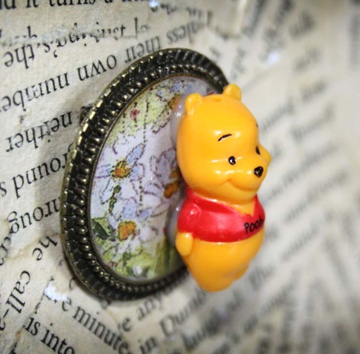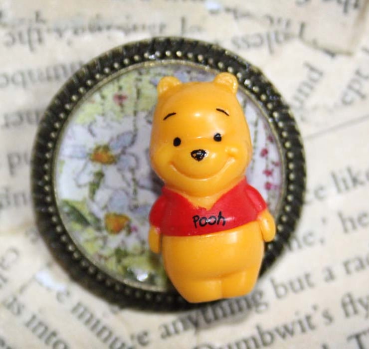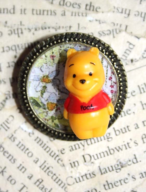 This cute little Winnie the Pooh figure began its life as a mobile phone charm. Made redundant and destined for landfill, it has been upcycled into an unique character brooch. Pooh sits on a background of flower scrapbook paper which has been sealed with resin.