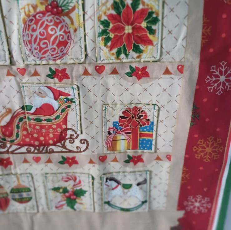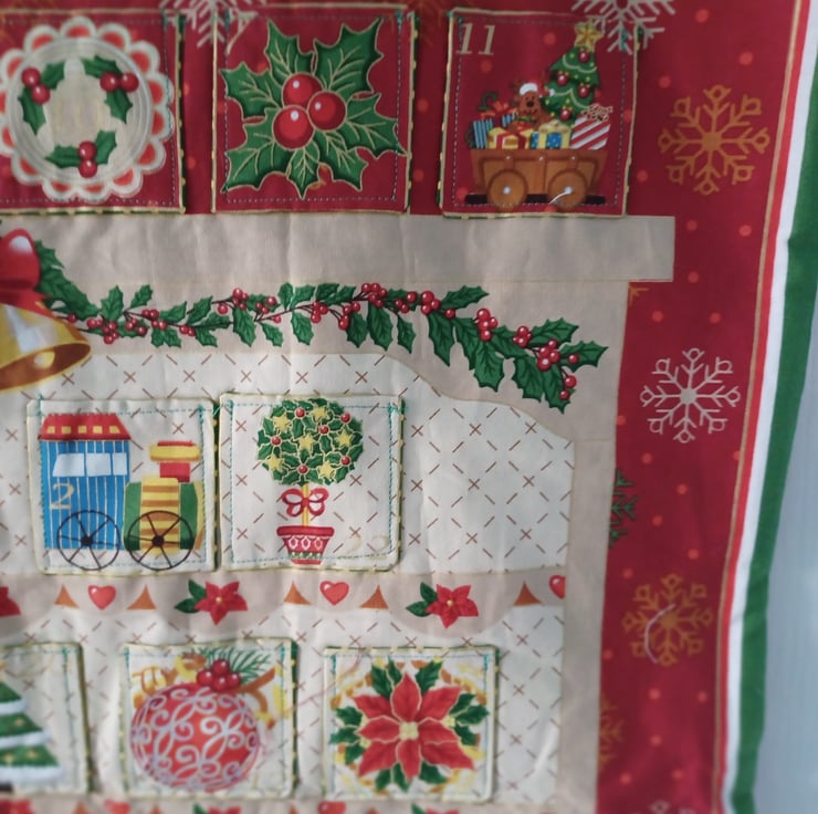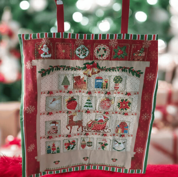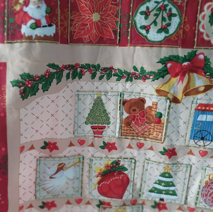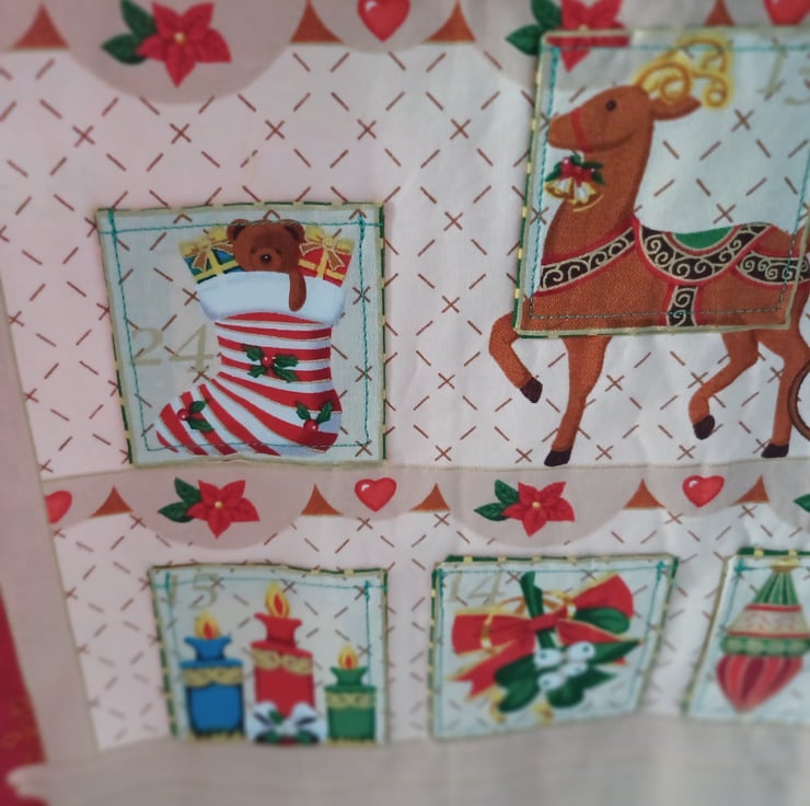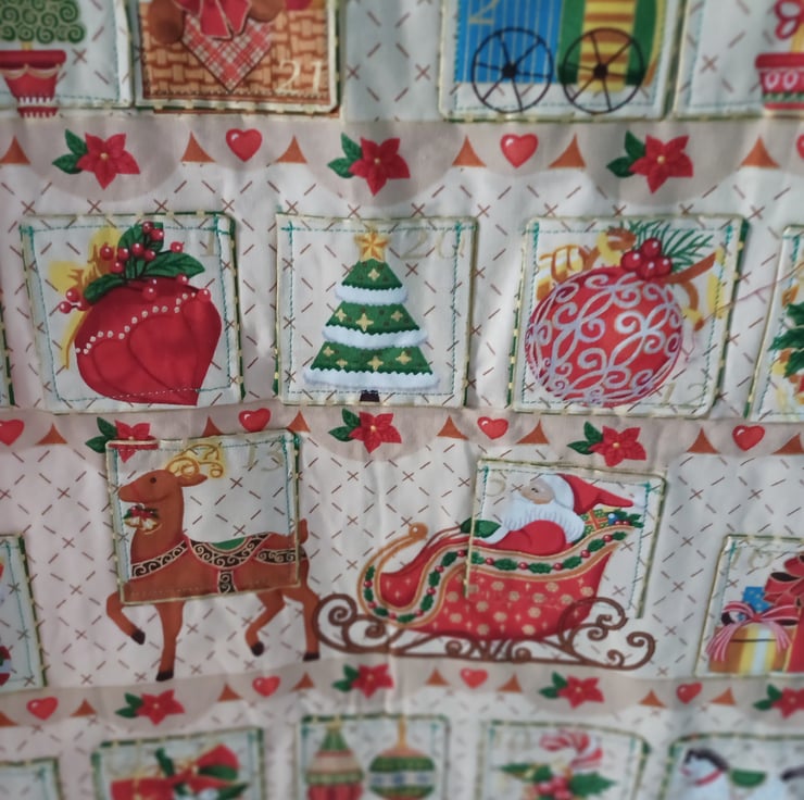 Santa and one of his reindeer are surrounded by the joys of Christmas in this traditional advent calendar panel. This calendar is padded and lined and has two sleeves for hanging. All you need to do is decide what you would like to fill each of the 24 pockets with to make your calendar complete! These calendars can be reused year after year without the need for plastic trays that are found in shop bought ones. Make one of these lovely calendars part of your Christmas traditions.