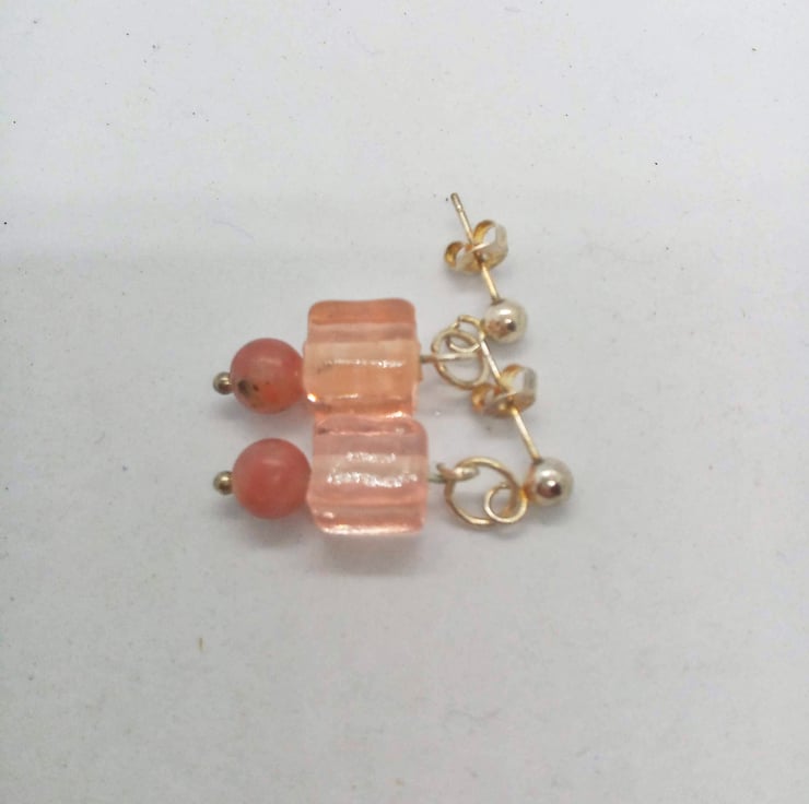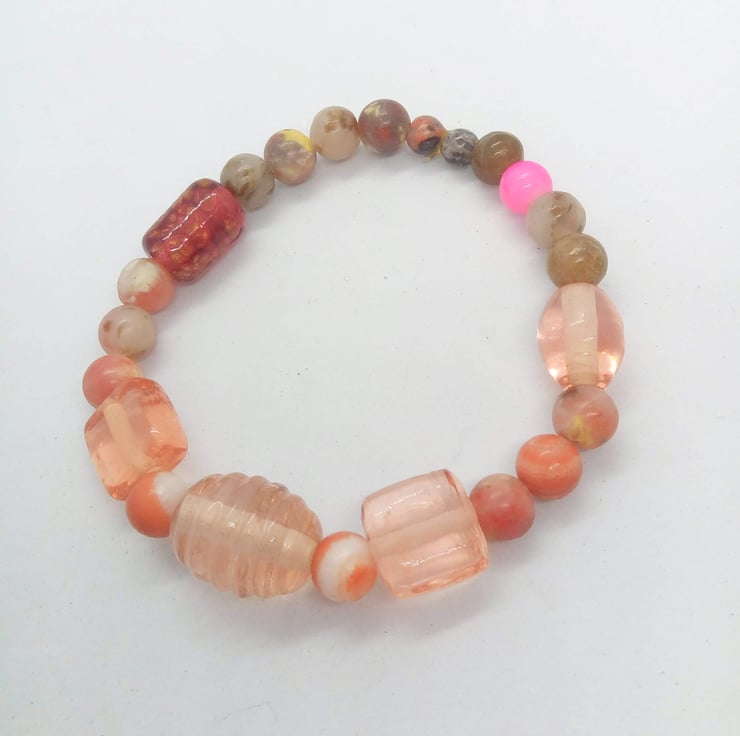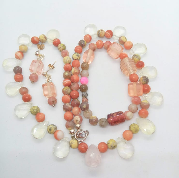 This lovely set is made using 6 mm spider jasper beads with 14 mm x 12 mm clear and peach glass tear drop shaped beads. The earrings are a peach glass cube bead and a spider jasper bead and they have silver plated ear studs. The Necklace has a silver plated toggle clasp and the bracelet is elasticated with spider jasper, picture jasper and pink glass beads.
