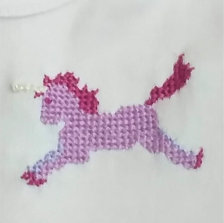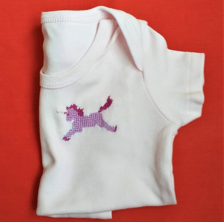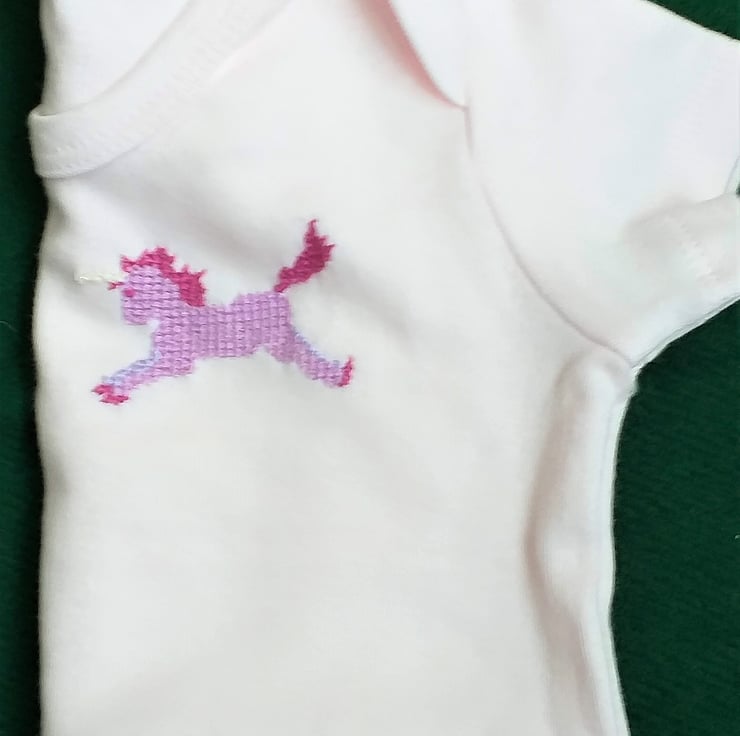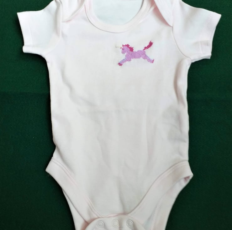 This is a very pretty baby-pink vest/onesie made extra special by the prancing pink unicorn I have hand-embroidered on the left front. It has a magenta mane, tail and hooves, and a sparkly ivory horn. The vest has an envelope neck, short sleeves and three press studs between the leg openings. It is 100% soft cotton and can be machine washed.