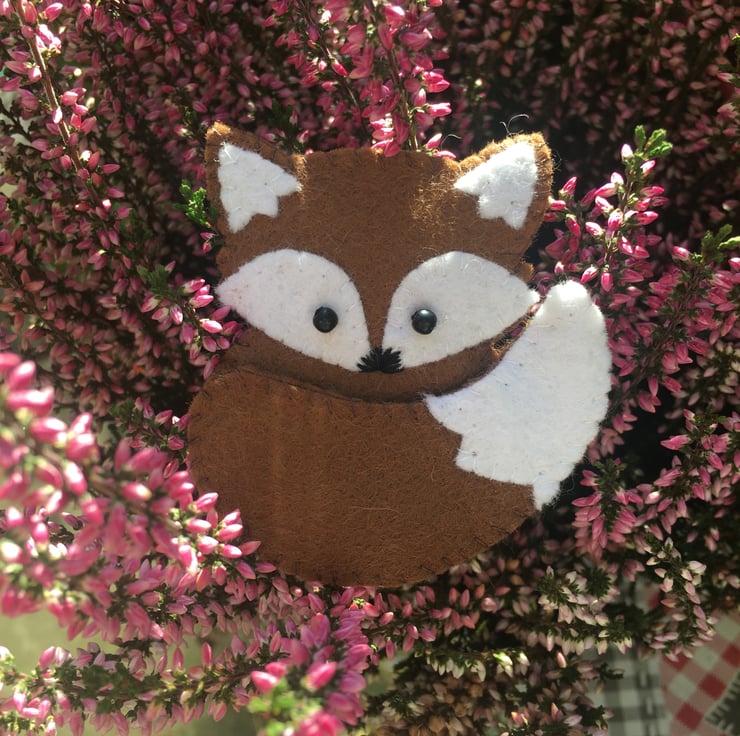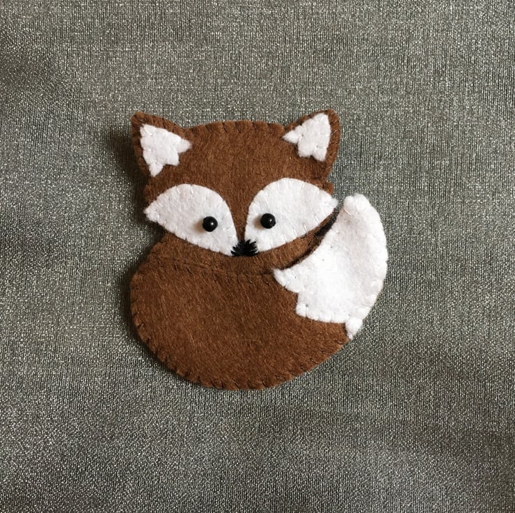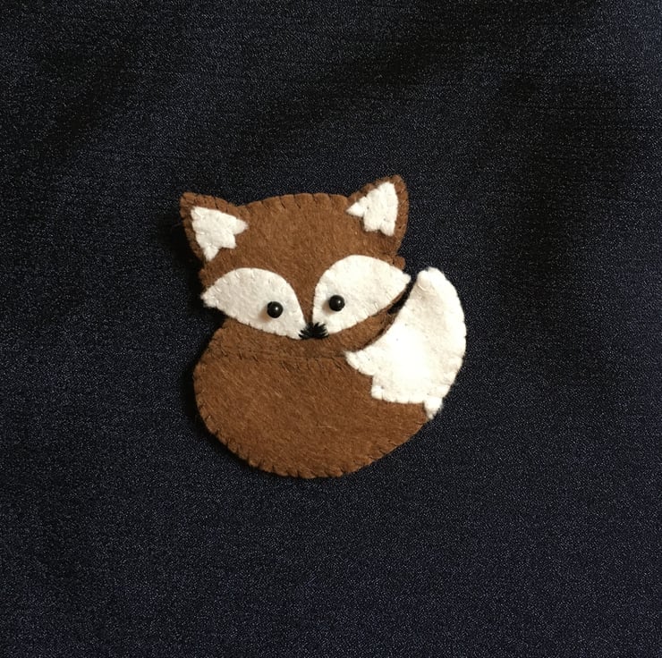 A stylish handmade and hand sewn brown felt fox brooch. The fox has been embellished with beaded eyes and an embroidered nose.
