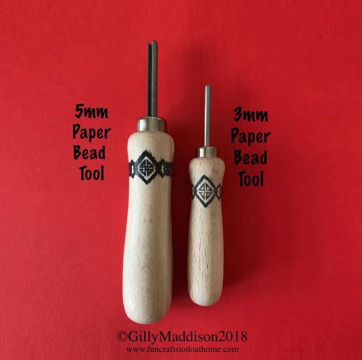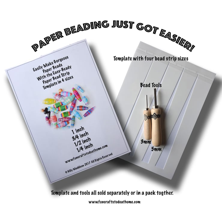 Two paper bead making tools and the reusable template. You'll get the two tools, the 3mm paper bead tool for making beads with a smaller core hole and the 5mm paper bead tool for making European style beads, sometimes called large hole beads, with a 5mm core hole for using thicker stringing materials. The template is for making paper bead strips in four different sizes - 1inch, 3/4 inch, 1/2 and 1/4 inch. By buying the tools and template together in this kit, you save £3.00 on the individually priced items.