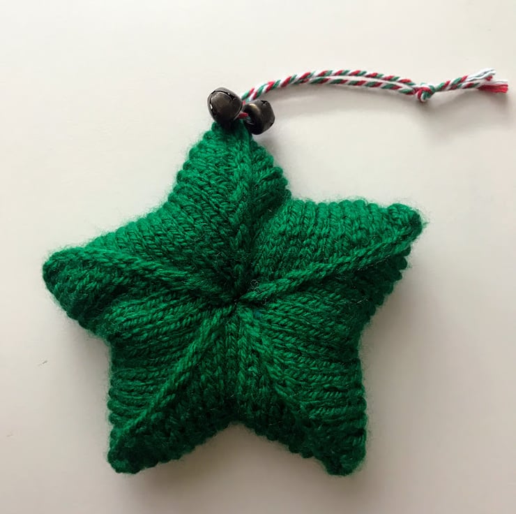 This is a lovely little 5 pointed star, knitted in green acrylic yarn and stuffed with toy grade wool stuffing which conforms to EN71, BS1425, BS5852. The star is finished with two brass jingle bells and red, white and green baker's twine to hang.