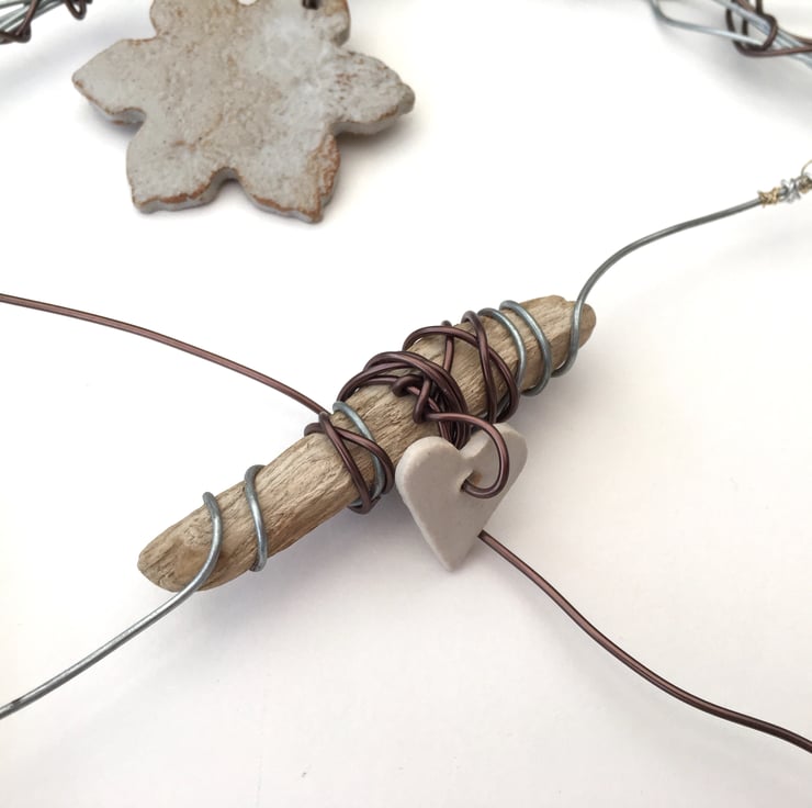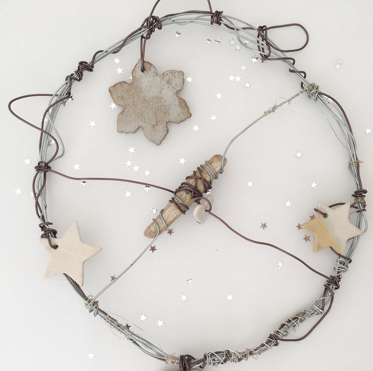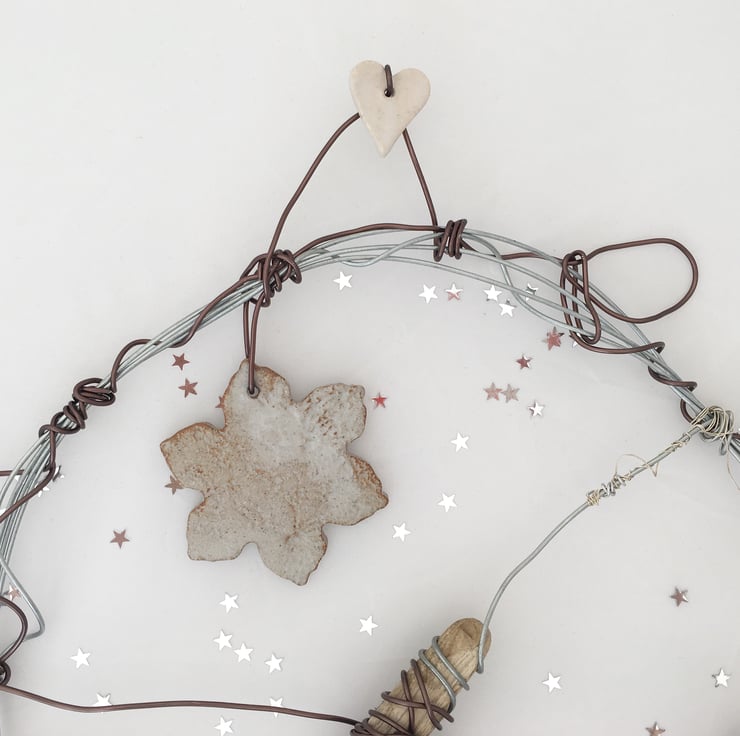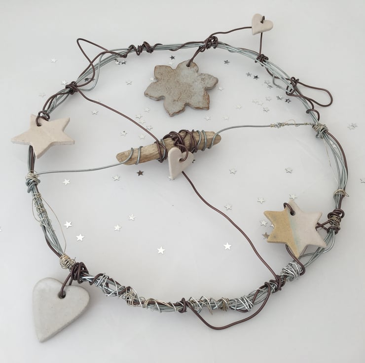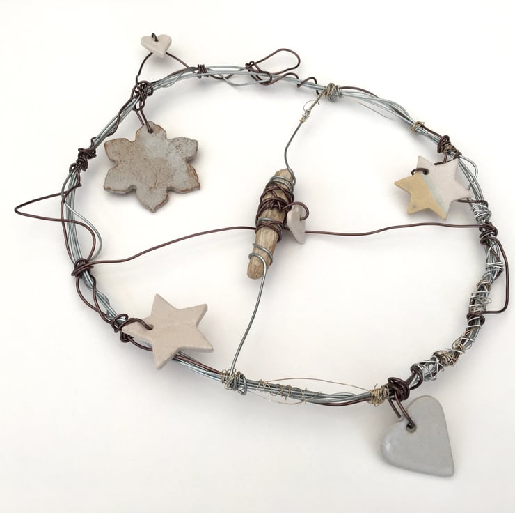 I have attached one snowflake, two stars and two love hearts made of clay which are also made by hand by me. There is also a small piece of driftwood attached to the inner circle of the sculpture.