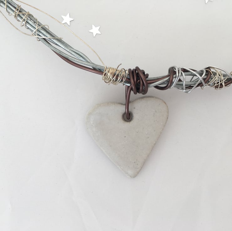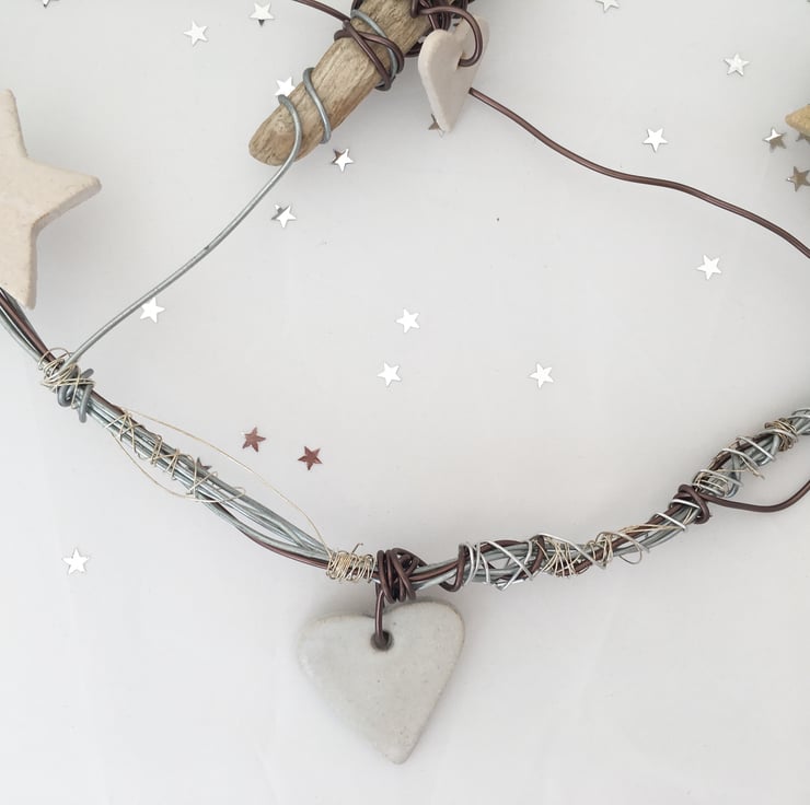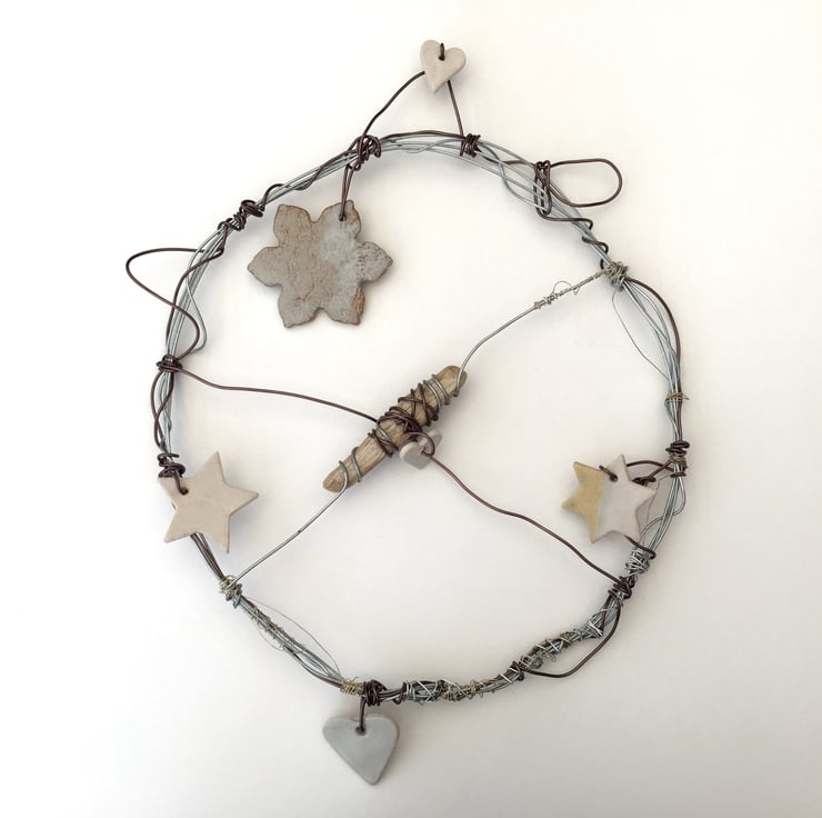 I have attached one snowflake, two stars and two love hearts made of clay which are also made by hand by me. There is also a small piece of driftwood attached to the inner circle of the sculpture.