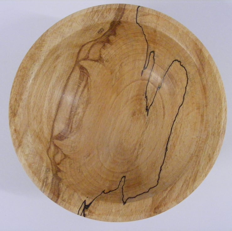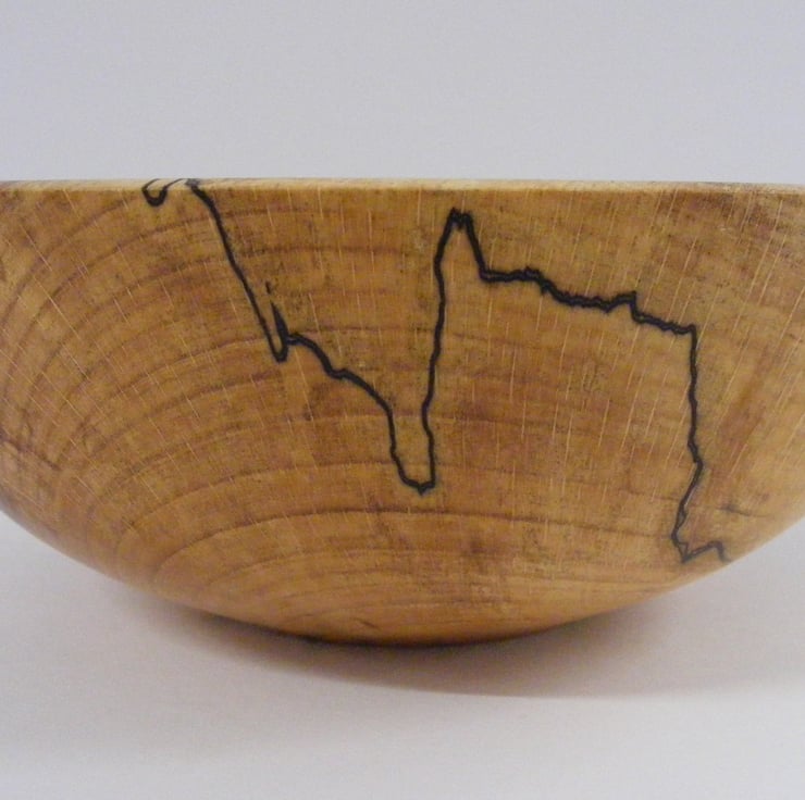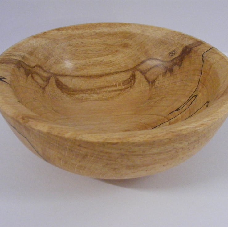 Spalted beech bowl 175 x 65mm, finished in Danish oil. A lovely spalted beech bowl with a sloping rim and distinct spalting lines as well as some nice colour variation in the grain. The spalting comes from natural processes in the wood after it is cut. It would make a nice addition to any home as decoration or for storage of small objects.
