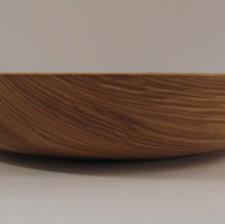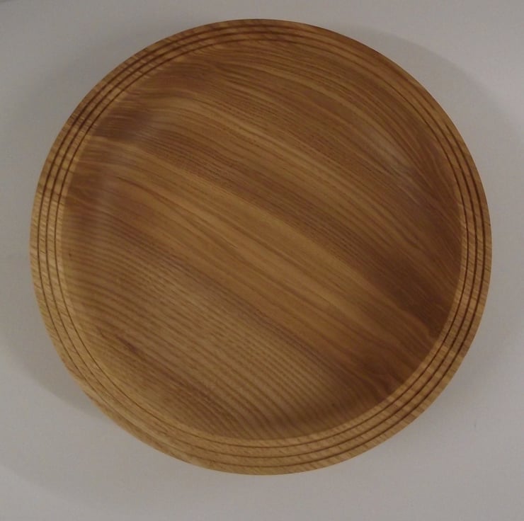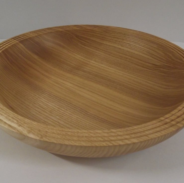 Ash salad bowl, 247 x 45mm, finished in food safe oil. A really nicely grained piece of olive ash, which combines the darker heart wood with the lighter outer wood. Finished in several coats of food safe oil this shallow salad bowl would make a lovely addition to any home kitchen or dining room. it has a flat grooved rim.