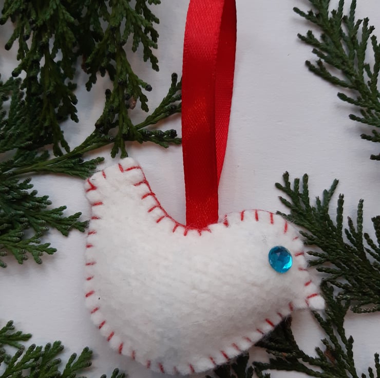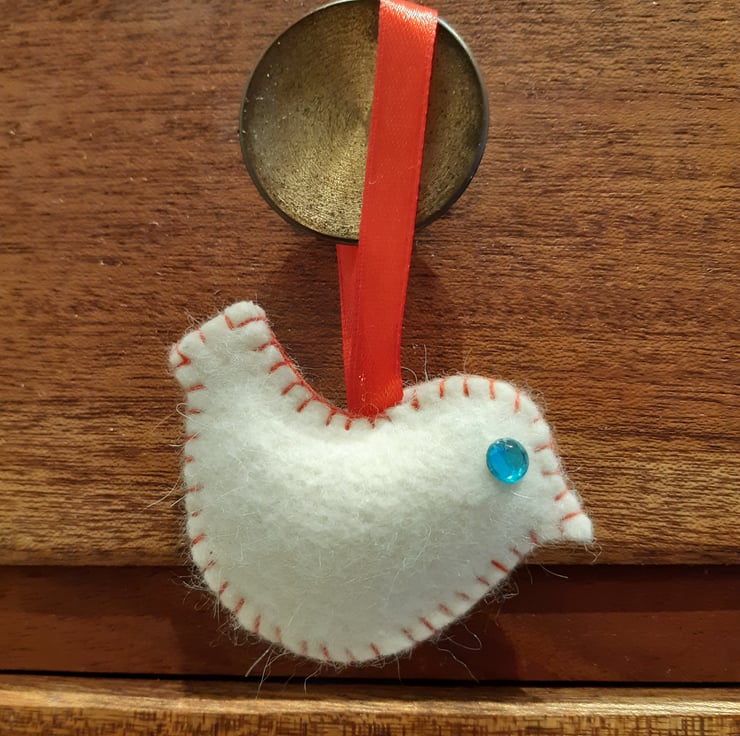 This little bird would look lovely as a christmas or wedding decoration. Lightly stuffed with cotton wadding (rather than plastic wadding), and made from an upcycled felted woolen jumper, its a bit more eco friendly. Reduce, re-use, recycle! Hand stitched round the edge with a red ribbon hanging loop, rhinestone eye details for a bit of sparkle. Same on the reverse as the front. Colour of the rhinestone eyes may vary from those in the photo - I have some with blue eyes, green eyes and red eyes. Please message me if you have a preference, otherwise you will receive a random eye colour.
