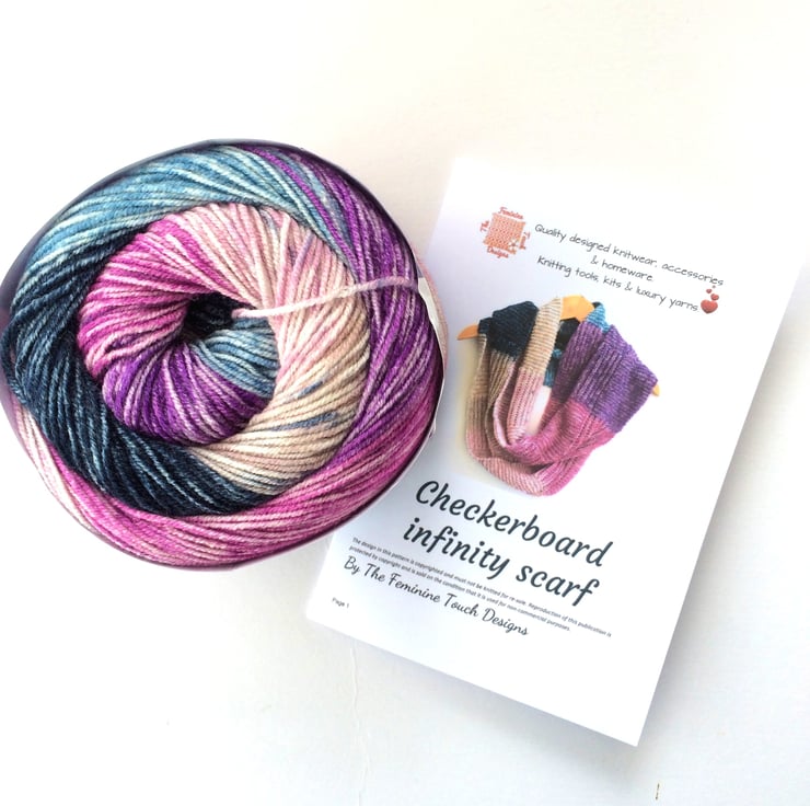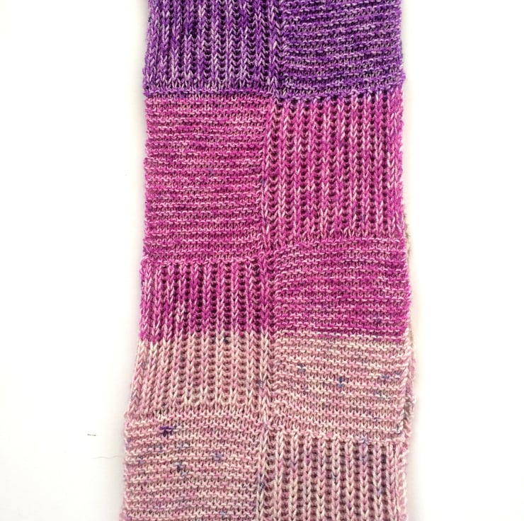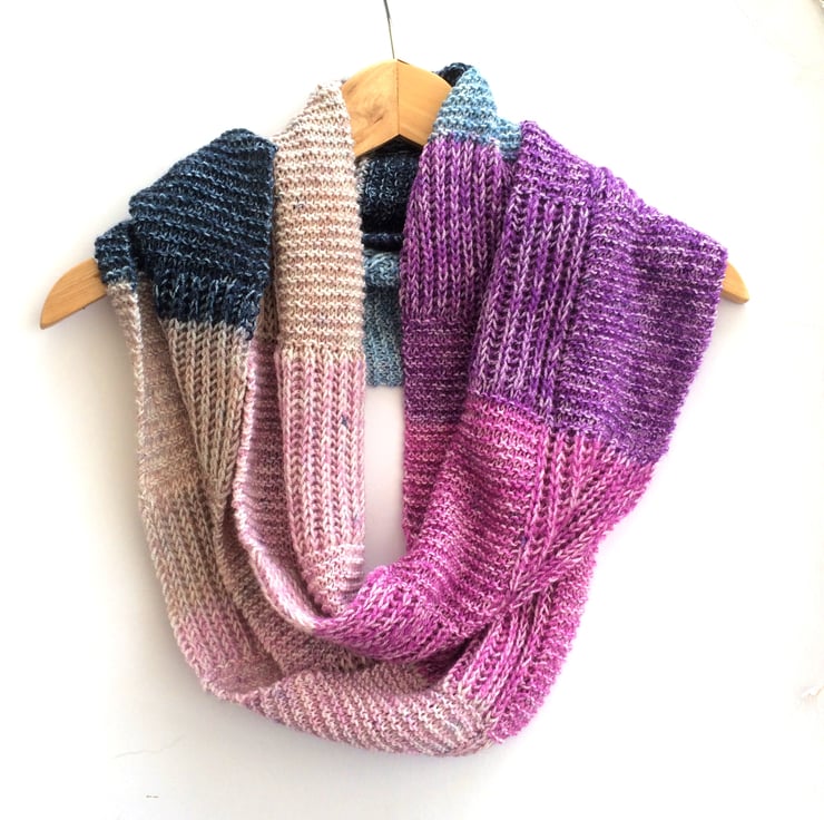 Simple beginners Brioche rib pattern is used alongside garter stitch to produce this interesting scarf. Alternating the Brioche - knit pattern produces the checkerboard result. Leave as a long scarf or sew the cast on and cast off ends together to produce an infinity scarf.