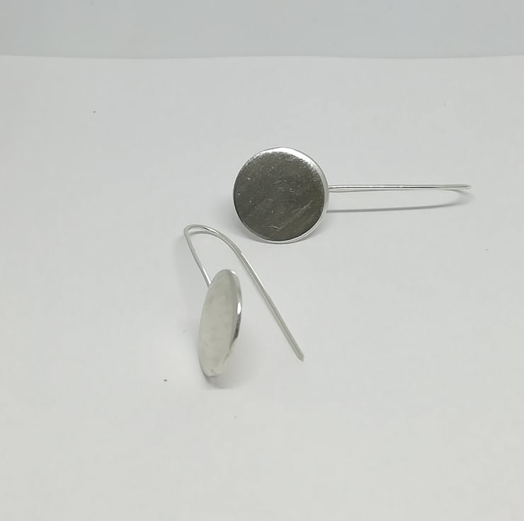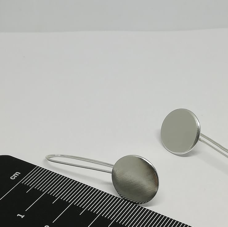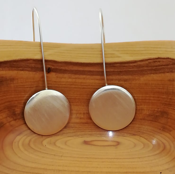 I love movement and also the sleek lines of geometric shapes. I chose a circular disc for these earrings and also a satin finish which catches the light in a gentle, muted way. The long ear hooks allow a gently movement when the wearer walks. The simple lines add elegance to any outfit.