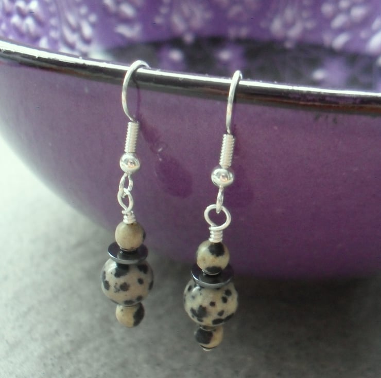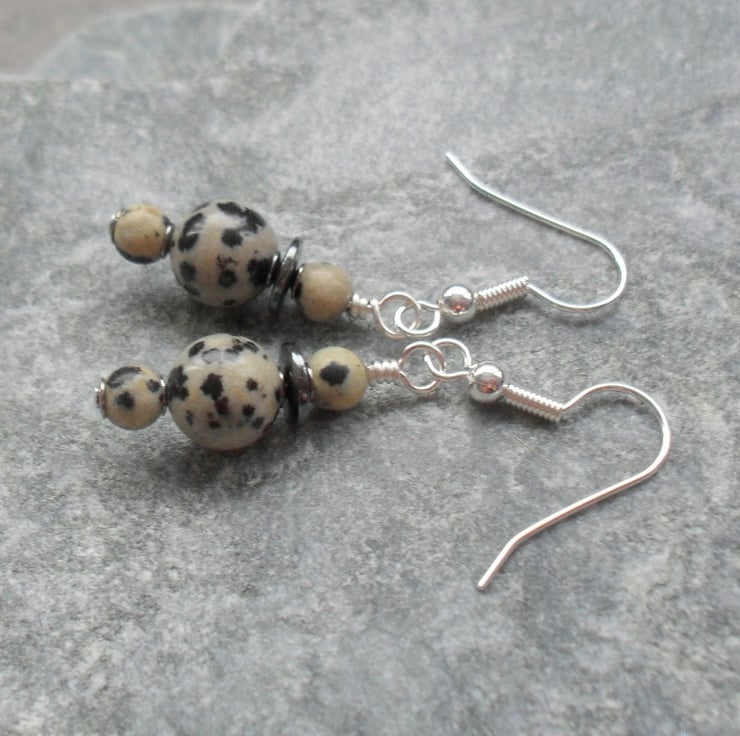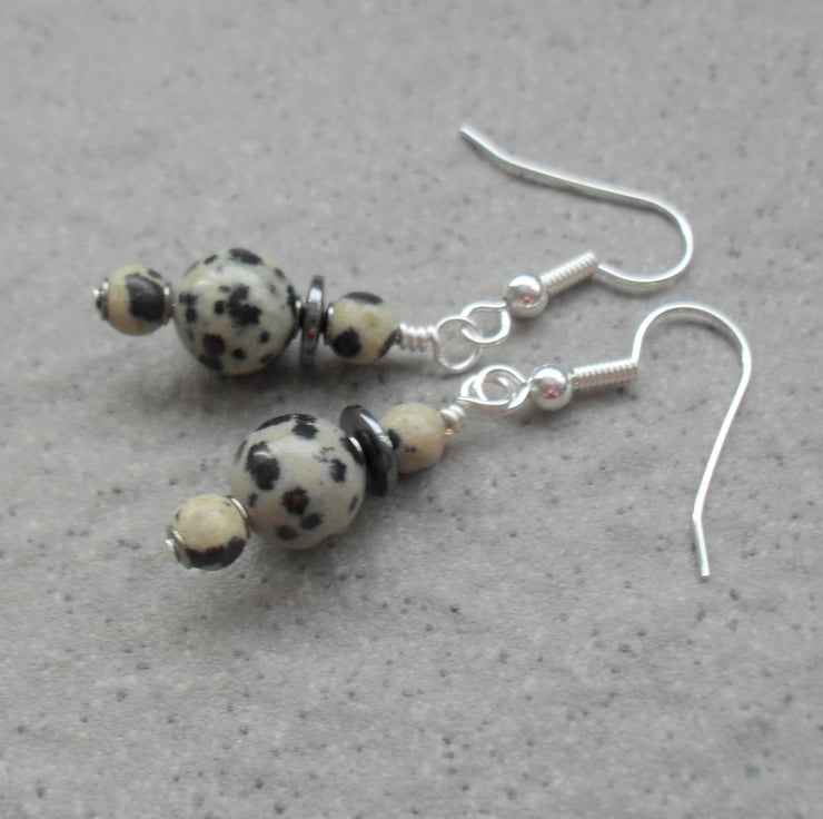 Dalmatian jasper and small disc's of haematite beads are attached to silver plated ear wires.