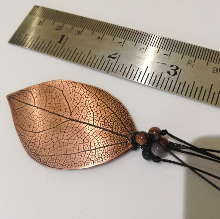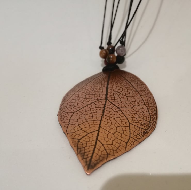 This copper leaf necklace is made by heating then rolling copper with a skeleton leaf to get the imprint of the veins. The copper is then oxidised followed by painstaking sanding of the excess oxidation, using increasingly fine paper, until only the imprint of veins is left.