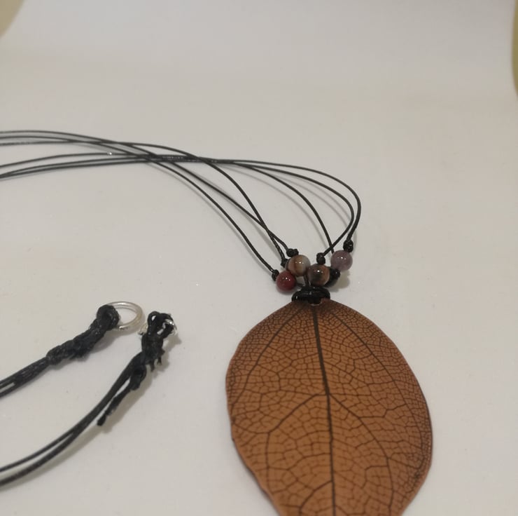 I have chosen waxed cotton instead of a chain, as this feels more in keeping with the organic feel of the leaf. I have also added beads of jasper to add colour and even more interest.