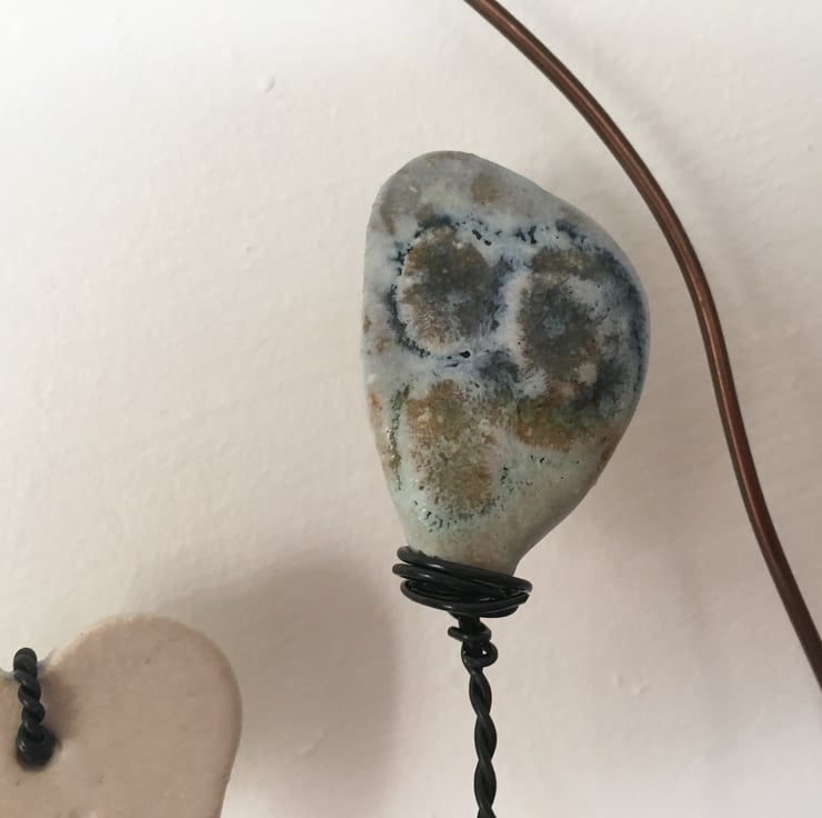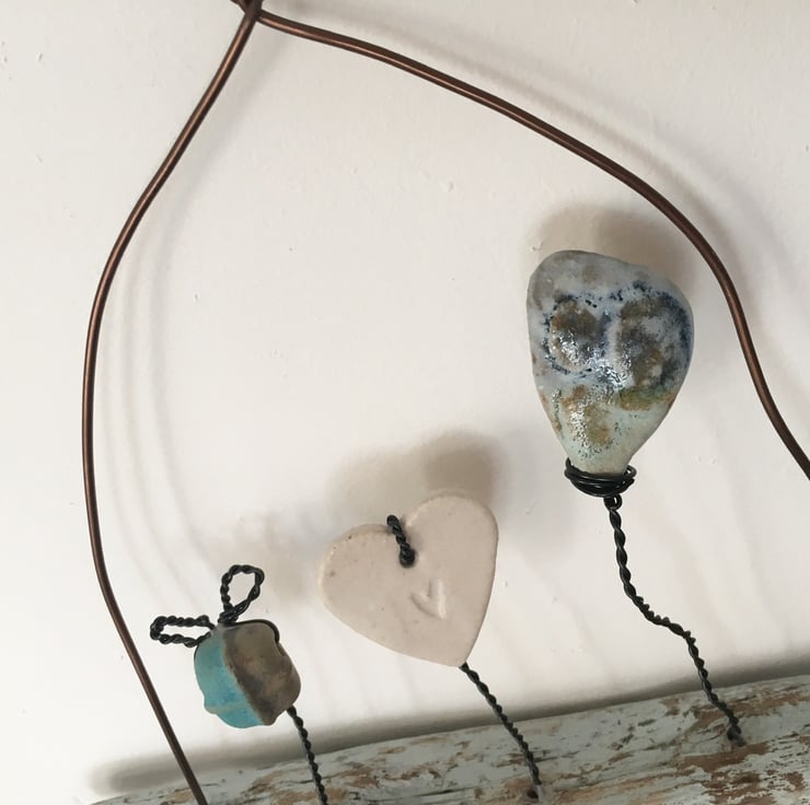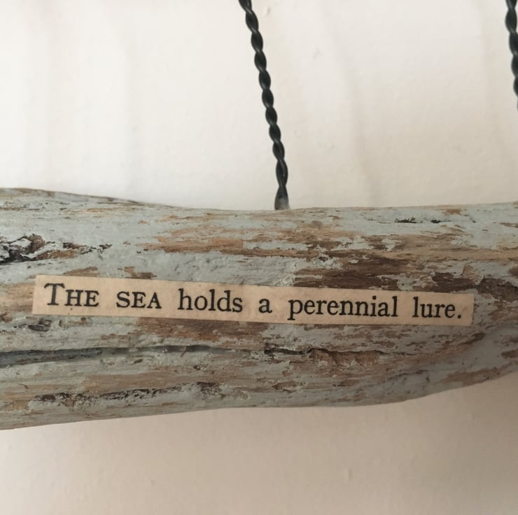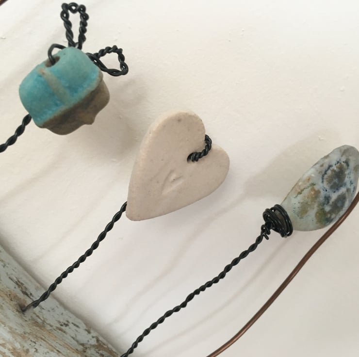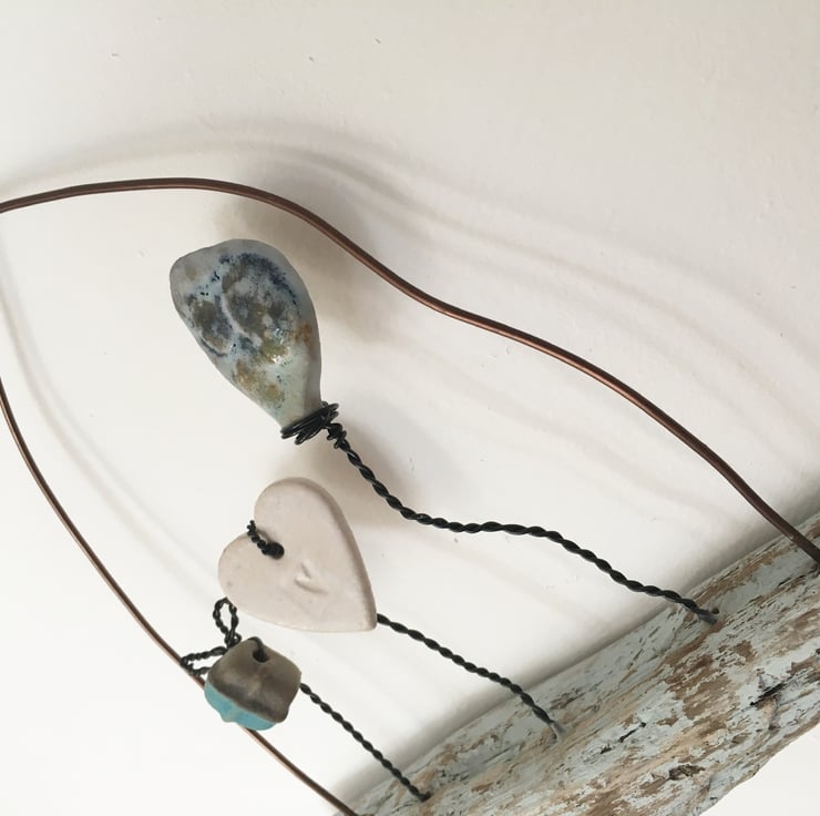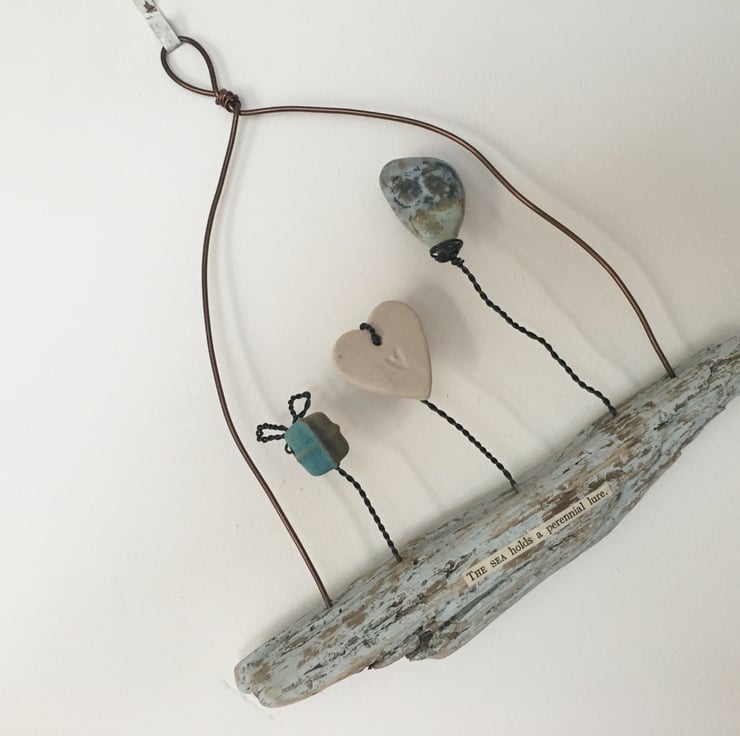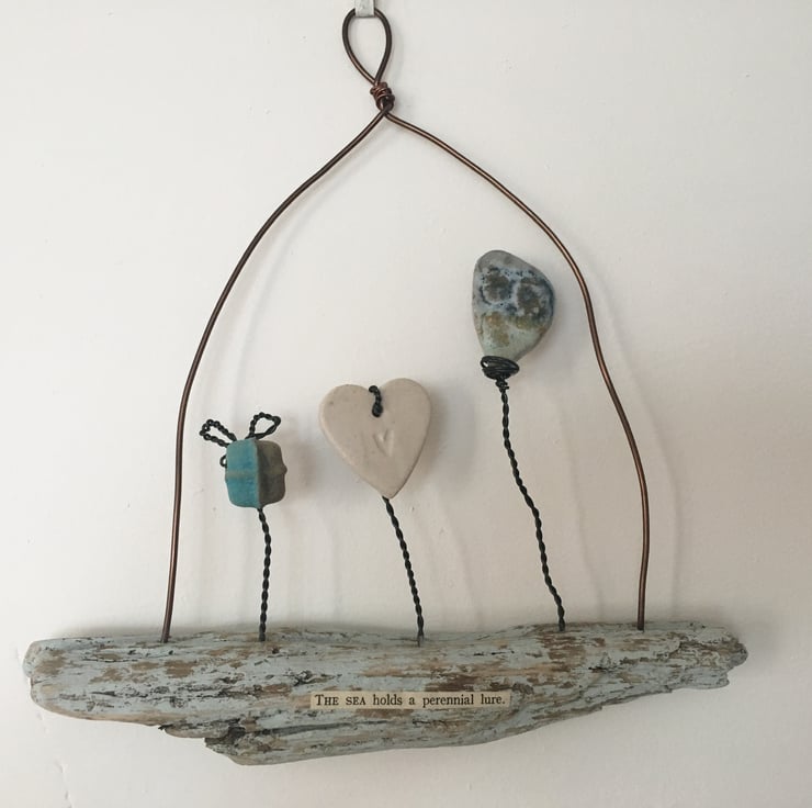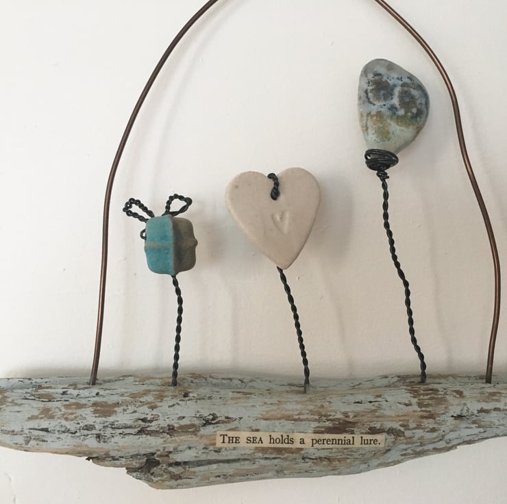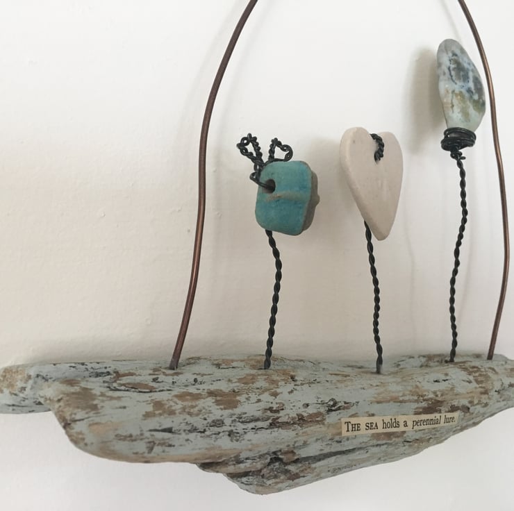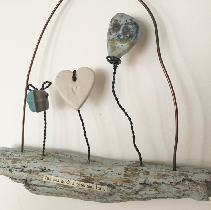 This piece is made using hand made ceramic designs made by myself. Each piece is made from stoneware clay and glazed by hand. The heart and ceramic pieces have been lovingly attached to the piece of driftwood using black aluminium wire. The driftwood is painted with an egg shell paint. Attached to the driftwood is the wording 'The sea holds a perennial lure'.