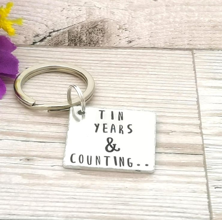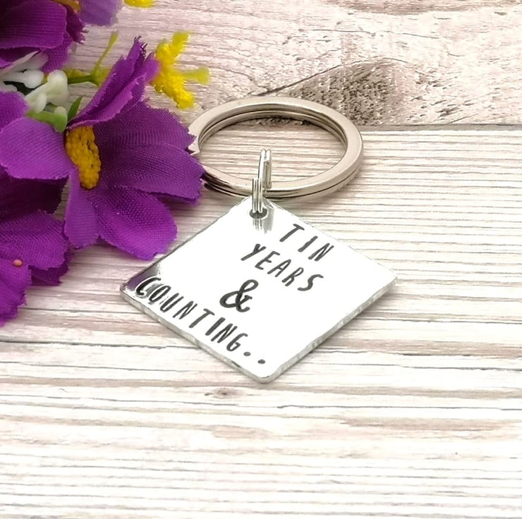 This square keyring will be made to order by hand stamping each individual letter onto a blank piece of aluminium metal. It is then polished and finished by painting each letter with black ink.