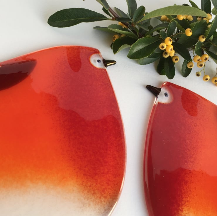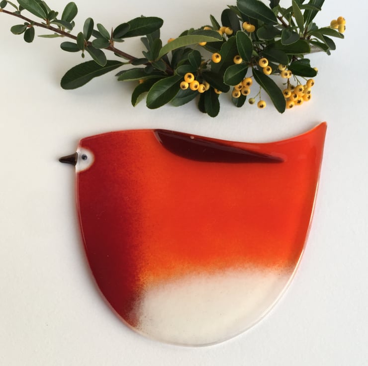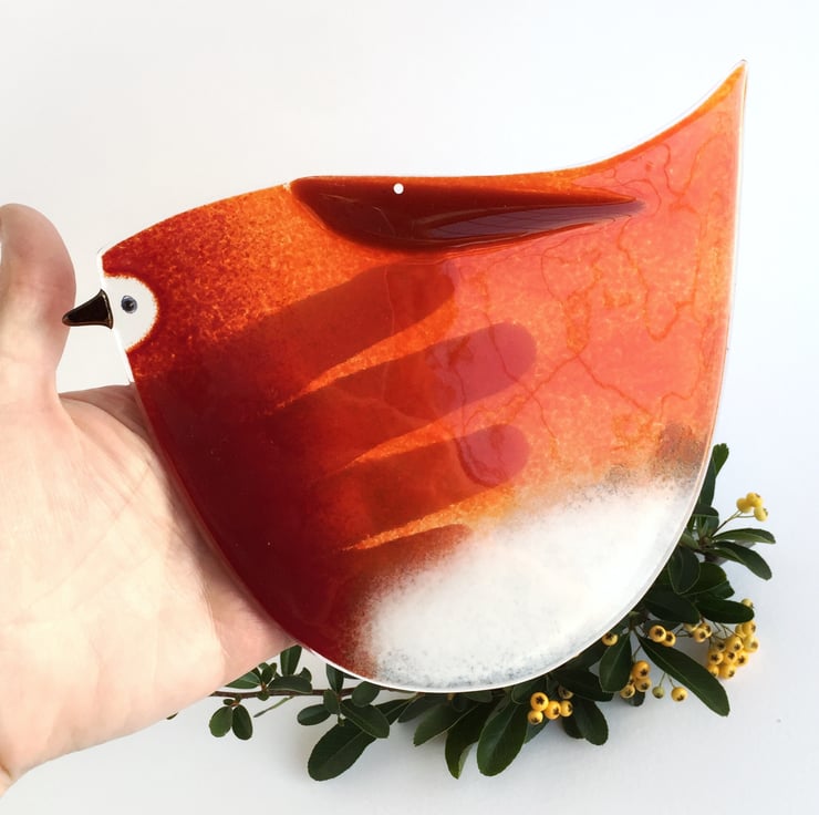 Each robin varies slightly as they are made by hand and therefore totally unique, just like a real robin. The reds vary from tomato red to deep red within the body and there is a white patch at the bottom and sumptuous carnelian brown wing.