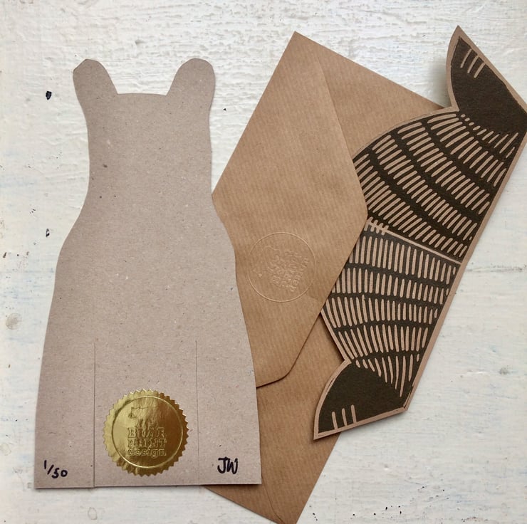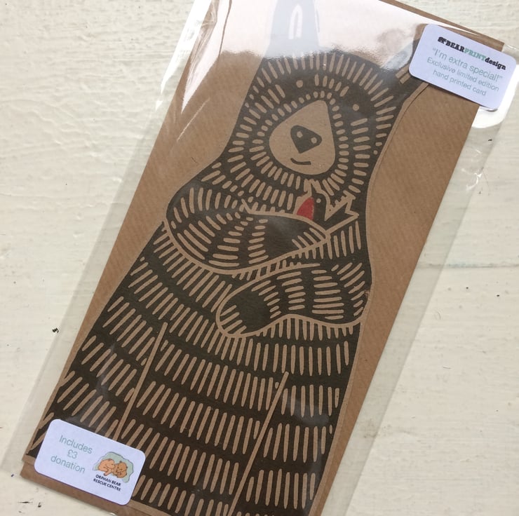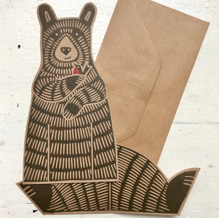 I've hand printed only 50 of these cards so they're extra special. 30 are like this one, hand-cut by myself and the remainder are listed as Make-Your-Own cards in my Folksy shop. As they're a limited edition each is numbered, initialled and presented with a gold embossed seal of authenticity. This adorable bear is printed in eco-friendly inks on brown recycled card, measuring approximately 10cm x 20cm. His legs slot into place to help him sit upright and he comes with an embossed brown ribbed envelope. Whether you give him or keep him he requires minimum maintenance, just a warm welcoming windowsill or a favourite shelf. Posted by first class post, please order quickly as I doubt he'll be around for long!
