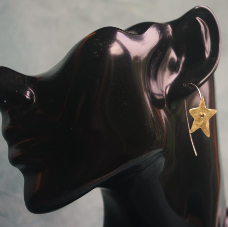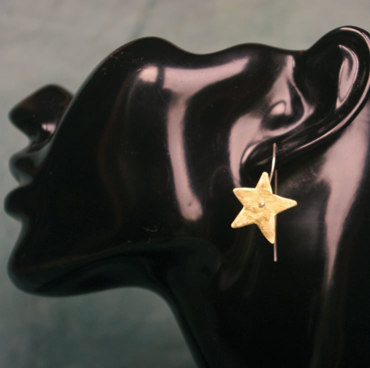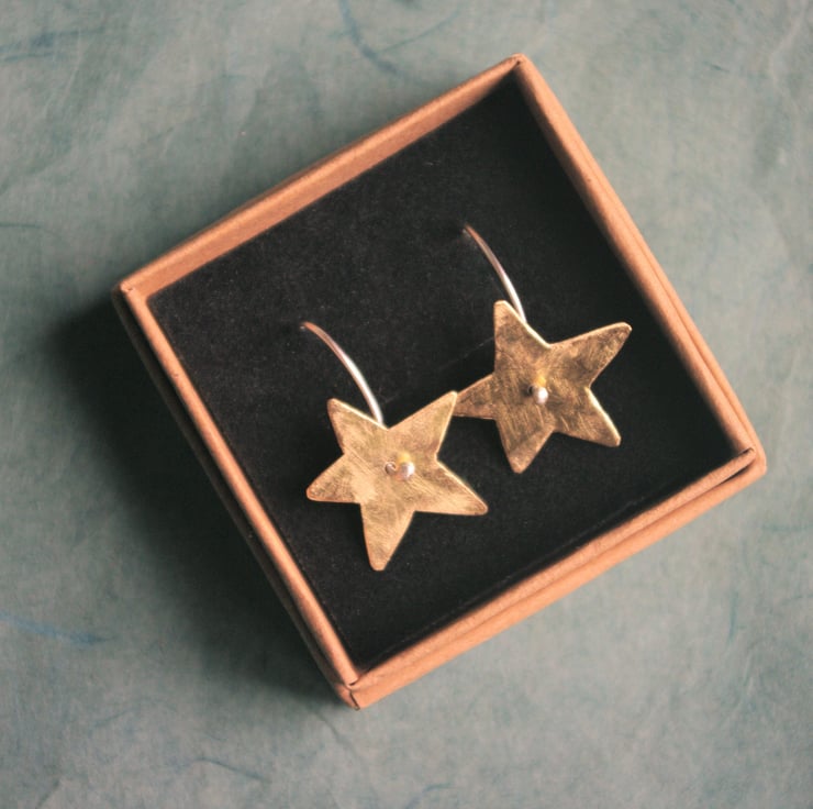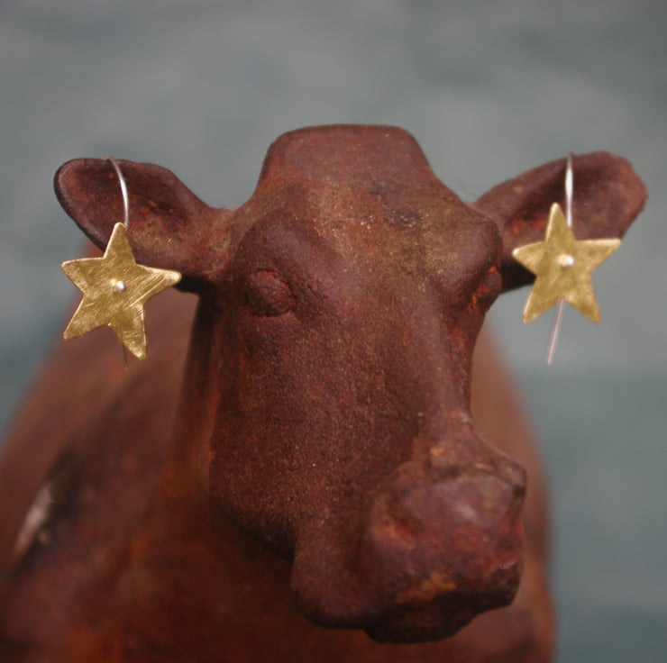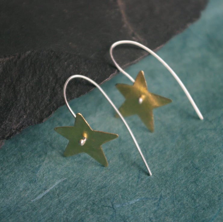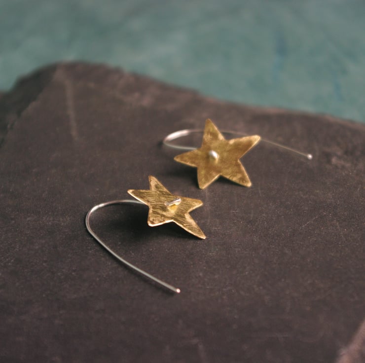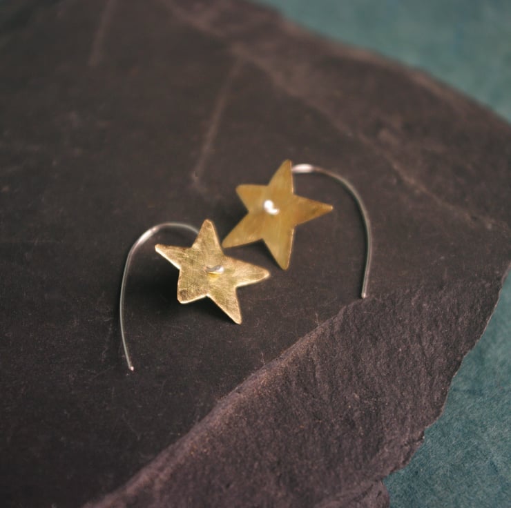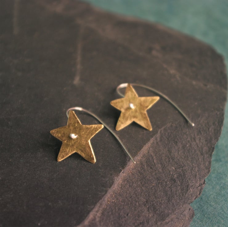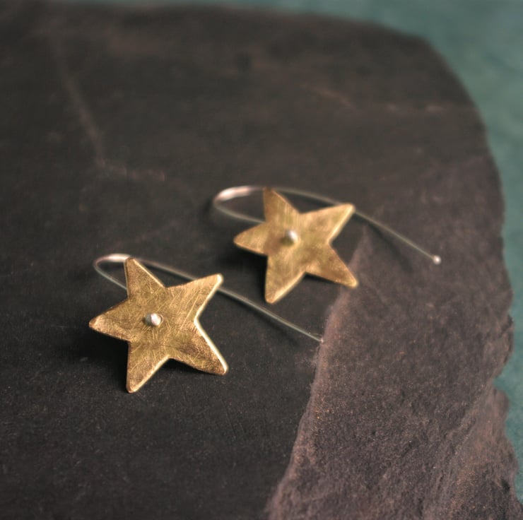 I have cut out 5 point stars from brass sheet. They are designed not to be symmetrical , so they have different length points and so have an un-mass produced look.The brass has a matt/frosted texture and the stars hang from sterling silver handmade ear hooks. The earhooks are attached through the middle of the stars ,so that they are able to spin around in a pleasing way!