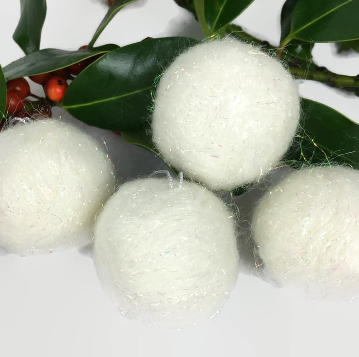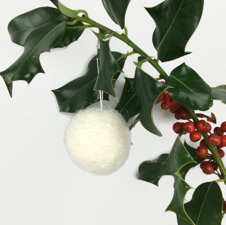 This listing is for one christmas snowball decoration. This sparkly snowball christmas tree decoration has been needle felted using woollen fibres and a barbed felting needle to produce the spherical shape. A covering of white merino wool fibres blended with sparkly angelina fibres produces a snowball that twinkles as the light catches it. Beautiful in its simplicity, the snowball has a silver coloured hanging thread attached enabling it to be hung from the tree. The decoration measures approximately 6cm (2.4") in diameter.