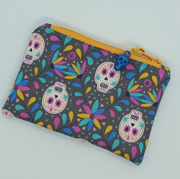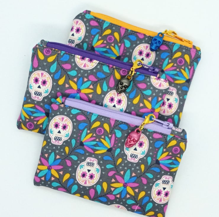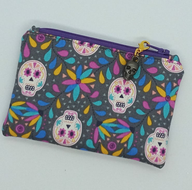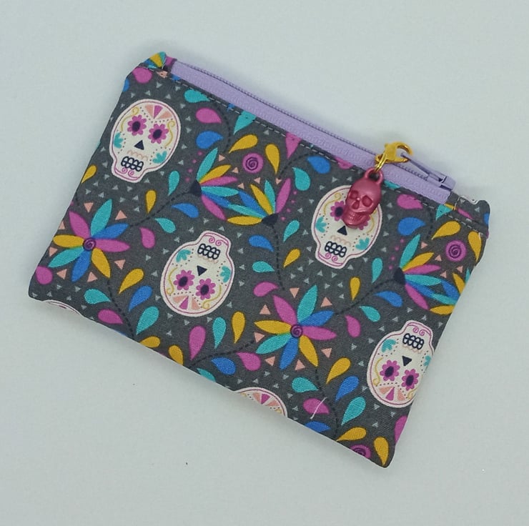 This gruesome lined coin purse measures 13x9cm and is lined in spotty fabric.