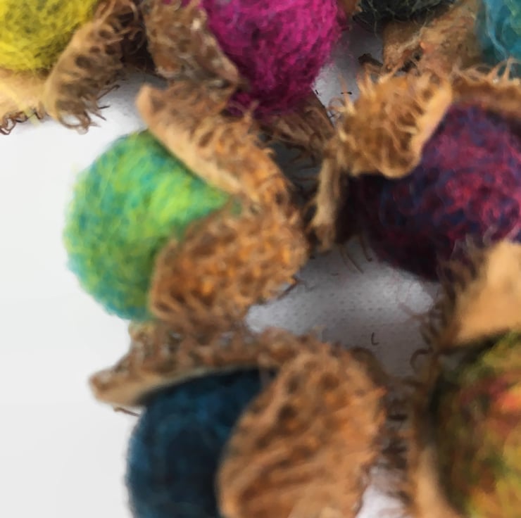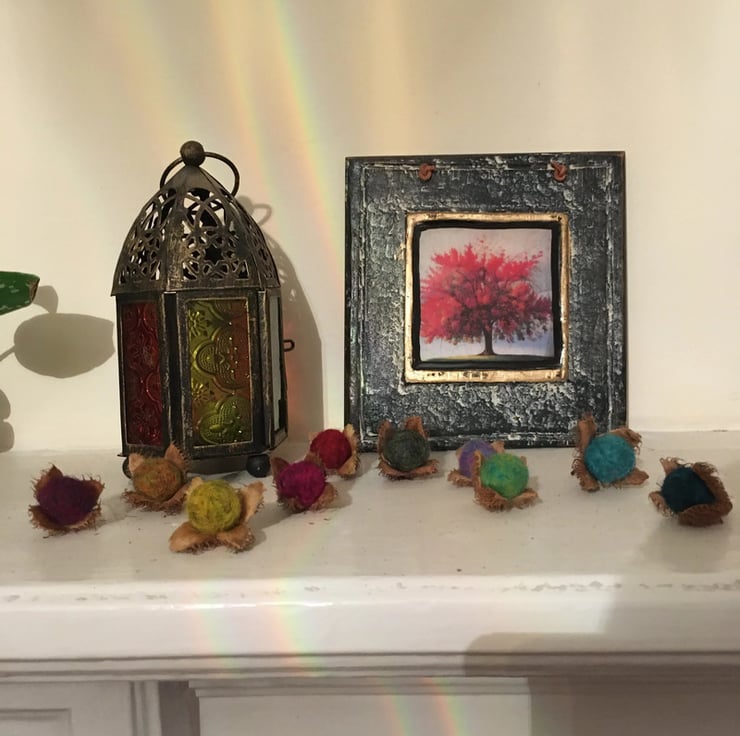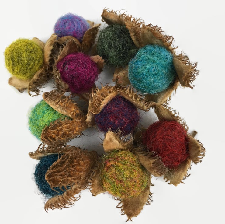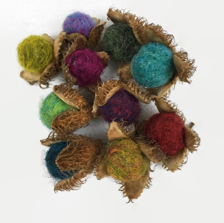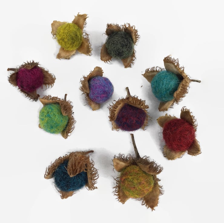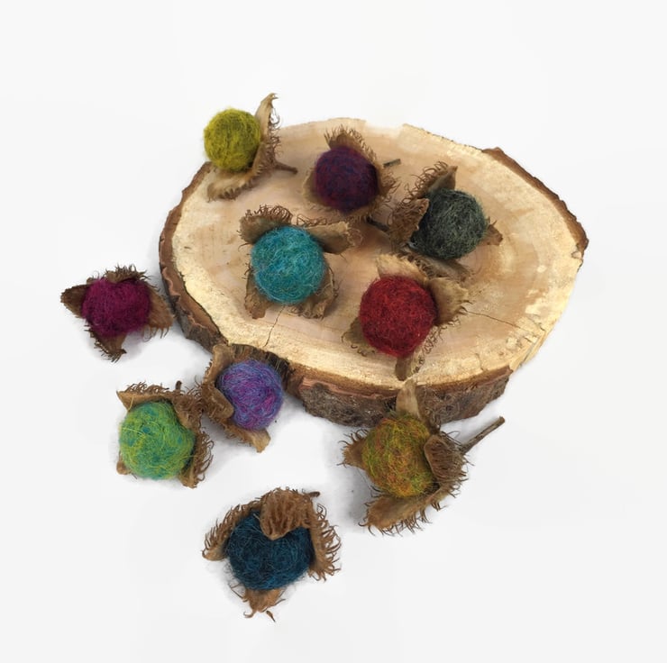 These brightly coloured beechnuts will provide a beautiful accent to your home decor. Made from needle felted woollen fibres the "beech nuts" have been glued into beech nut cases that have been scavenged from beneath a local copper beech tree. The cases have been cleaned, dried and sterilised prior to use so as to provide long-lasting decoration.