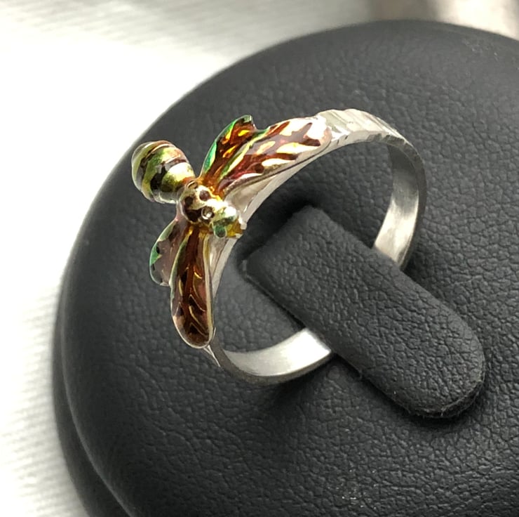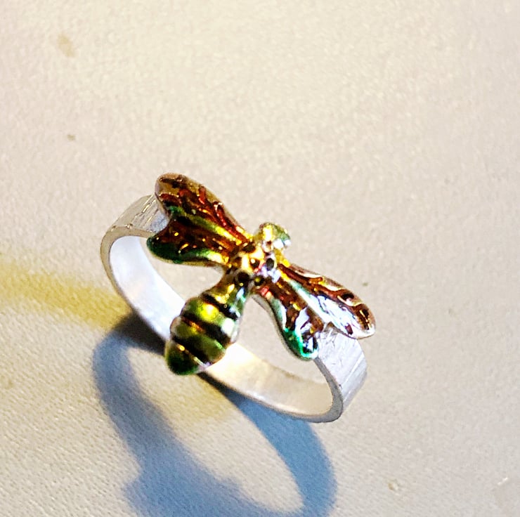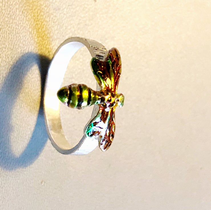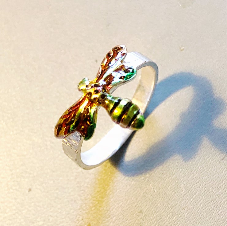 This large Bee in Flight Sterling Silver Ring stands out with its bright iridescent colours against the bark textured effect sterling silver silver band. The Sterling Silver Bee is pinned through the band before being soldered in place so is very secure. The wings bend to the shape of the band so as not to catch on clothing and sits nicely on the rounded shape. The band is 3mm wide and the Bee is 16 mm across the wings and 11.5mm from head to tail. The colour is achieved by the use of slightly coloured translucent resin which provides a very hard protective surface.