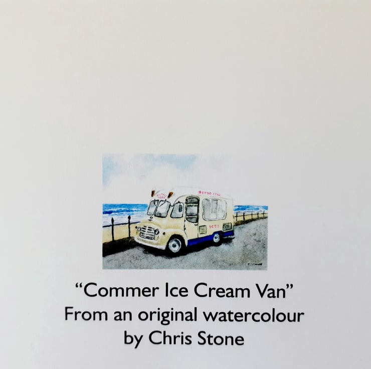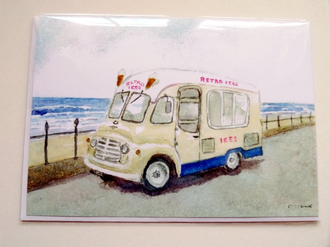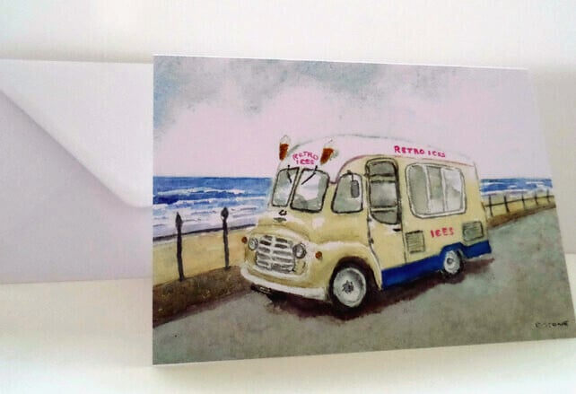 A professionally produced greetings card printed from from my original watercolour of a classic Commer ice cream van from the late 1950's/ early 1960's. I have placed her in an invented coastal sea front setting with imagined "Retro Ices" branding.