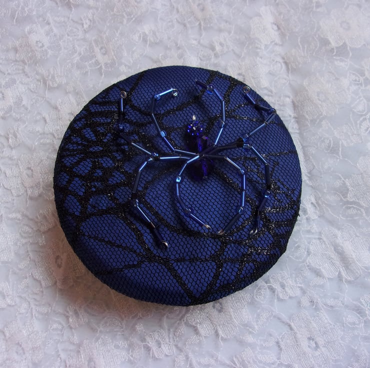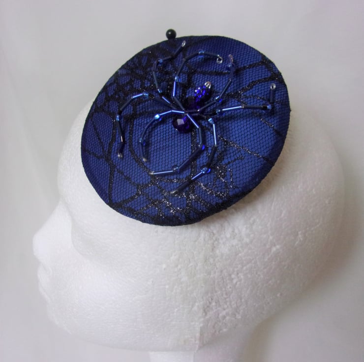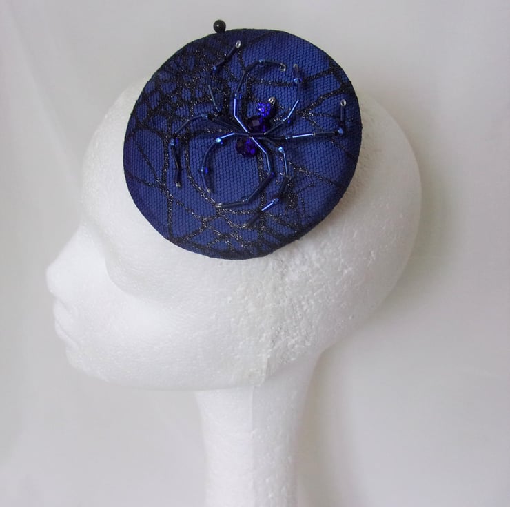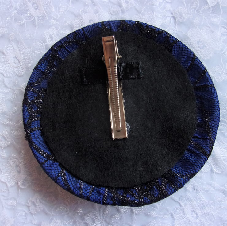 Created with a round sinamay base which is covered with royal blue satin fabric then covered again with a beautiful soft shimmering cobweb tulle fabric with a black circle of felt underneath with a metal croc clip for fixing.