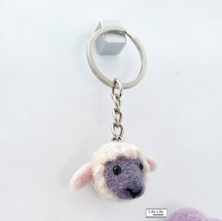 A quirky sheep keyring needle felted by Lily Lily Handmade. The cream and grey coloured sheep has been made with soft wool fibres. The shape of the sheep’s head has been created by stabbing the wool fibre to shape the wool fibre into a firm structure. The sheep is attached to a quality silver coloured keyring and chain.