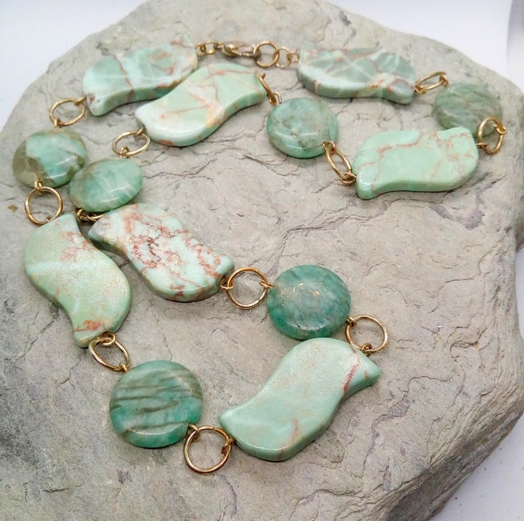 This gorgeous jewellery set is made using 40 mm x 20 mm wavy turquoise beads and 20 mm round disc beads joined together by silver plated jump rings. The necklace is secured by a gold plated lobster clasp and the earrings have gold plated ear wires.
